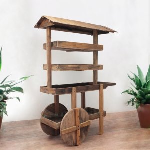 La fioriera in legno decorativa ALCYONIA è un autentico elemento d’arredo in stile arte povera, ideale per arricchire con carattere e calore spazi esterni come giardini, terrazze o ambienti d’accoglienza come bar e pub. Realizzata interamente in resistente legno riciclato, questa struttura fissa dalle dimensioni generose (140x60x200 cm) si distingue per l’estetica rustica e genuina, impreziosita dalla forma simile a un carretto con tettoia, dotato di dettagli scenografici come le ruote in legno pieno e i ripiani a più livelli che offrono ampio spazio per l’esposizione di piante, fiori decorativi o prodotti artigianali. Il colore marrone naturale valorizza le venature del materiale, trasmettendo una sensazione di autenticità e accoglienza visiva. La fioriera ALCYONIA unisce funzionalità e impatto estetico, diventando protagonista nell’allestimento di spazi outdoor o nell’arredo tematico di locali, dove può valorizzare l’esperienza del cliente con un tocco di personalità e fascino vintage.