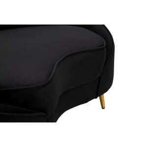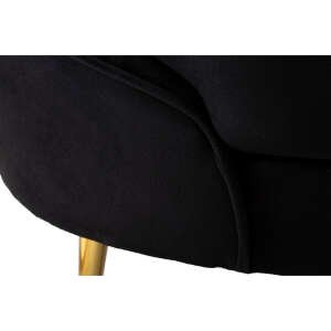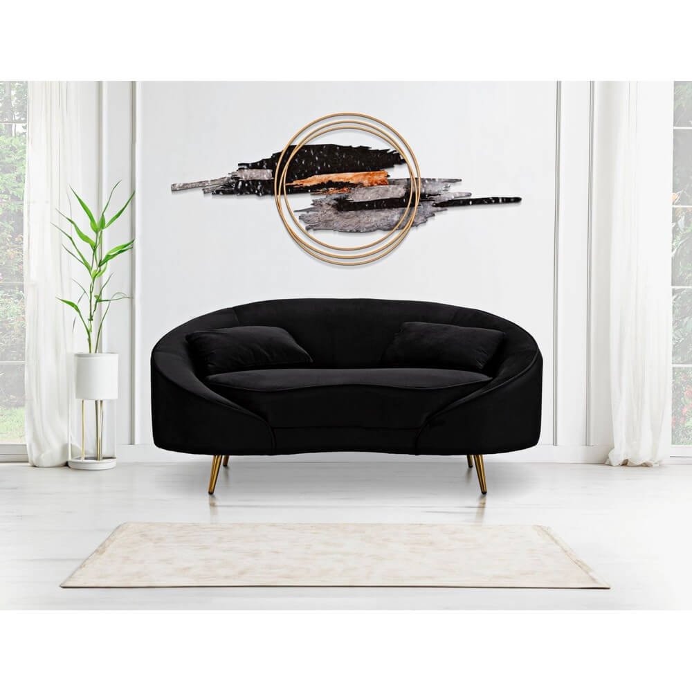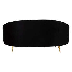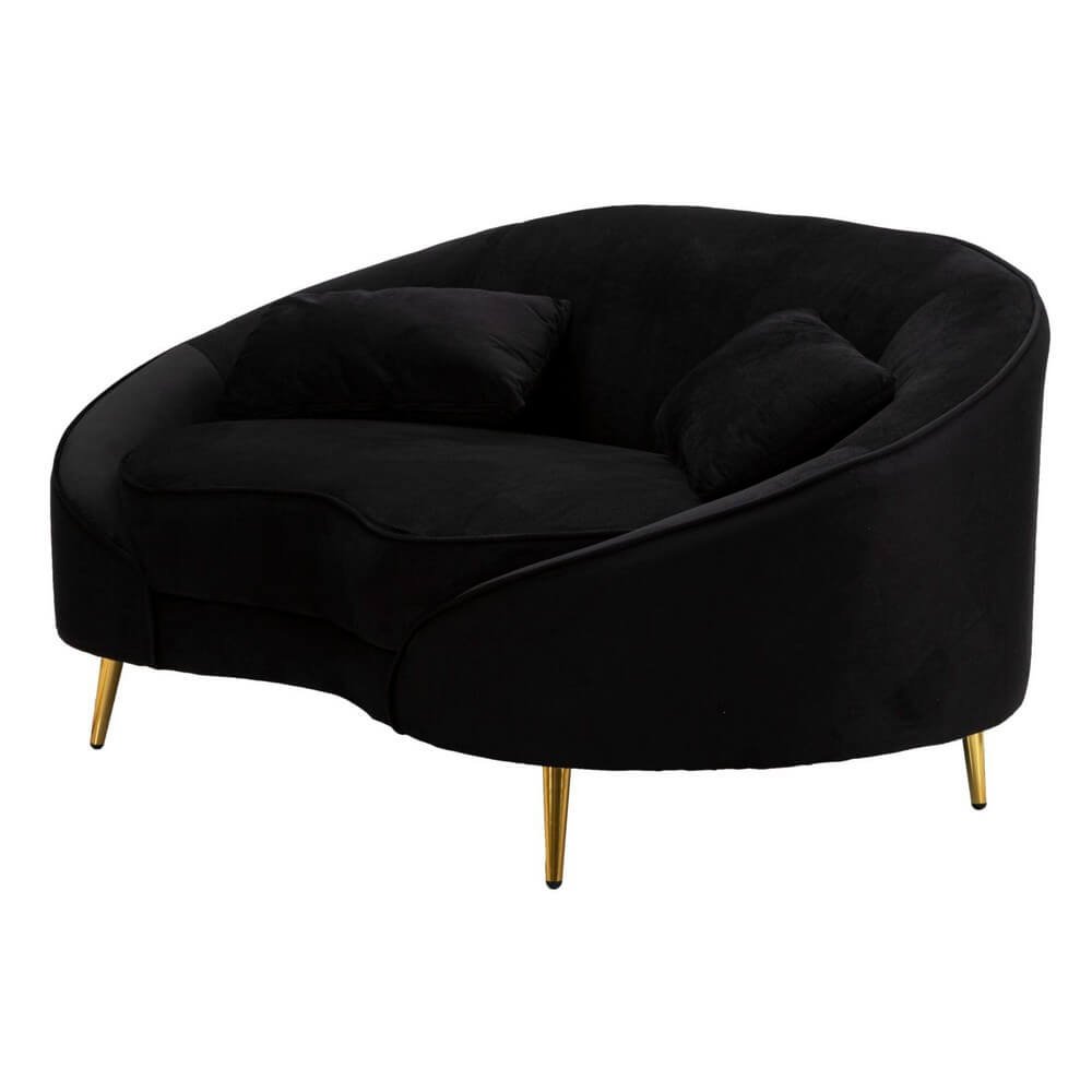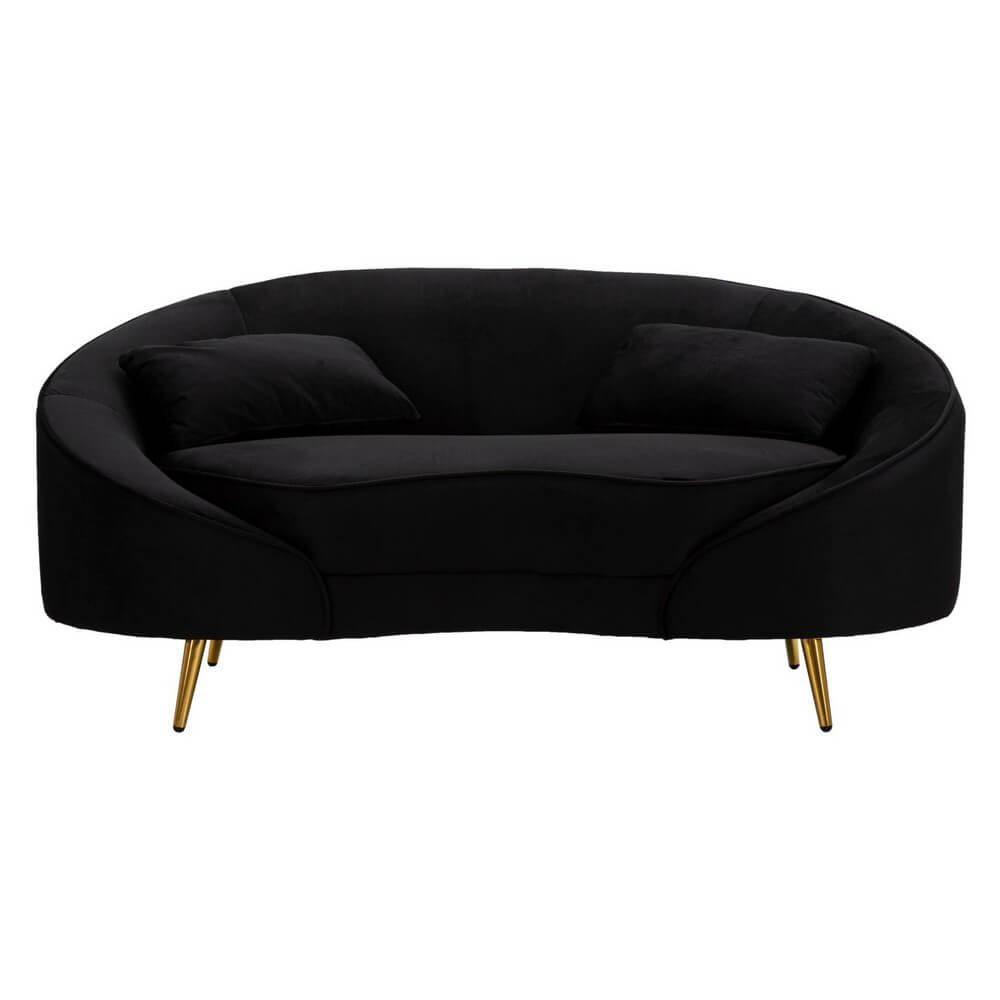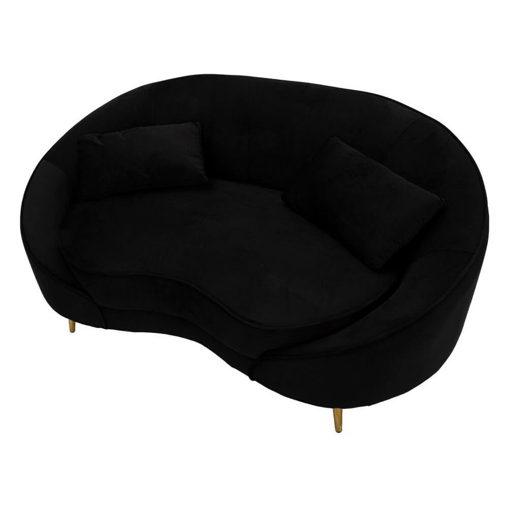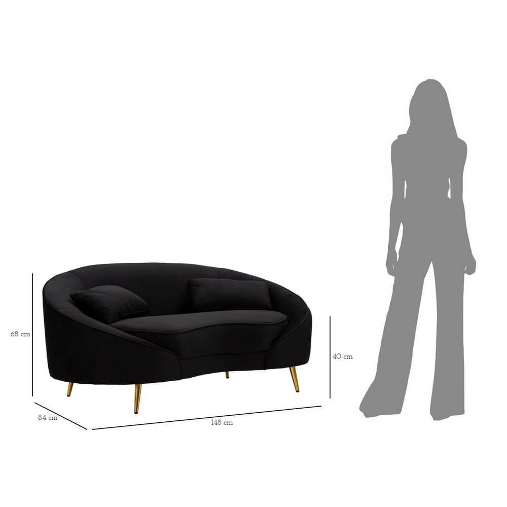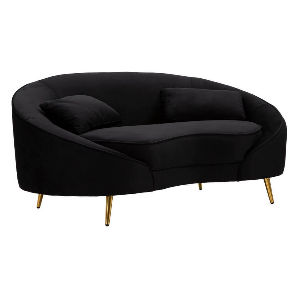 Divanetto 2 posti in tessuto imbottito nero dalle linee morbide e avvolgenti, le gambe in metallo dorato donano un tocco di classe e luminosità. Completo di 2 cuscini.