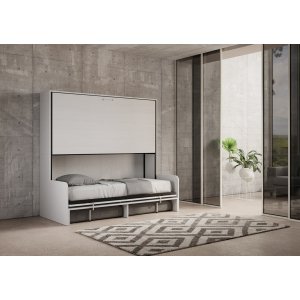 Letto a scomparsa orizzontale Kando versione con due letti singoli a castello con divano. Questo mobile salvaspazio è ideale per il living: funge da divano comodo di giorno e si trasforma velocemente in un letto confortevole quando serve, offrendo sia comfort che praticità, ideale per chi ha a disposizione spazi ridotti. I cuscini del divano, completamente sfoderabili, sono realizzati in microfibra. Il colore del rivestimento come immagini.