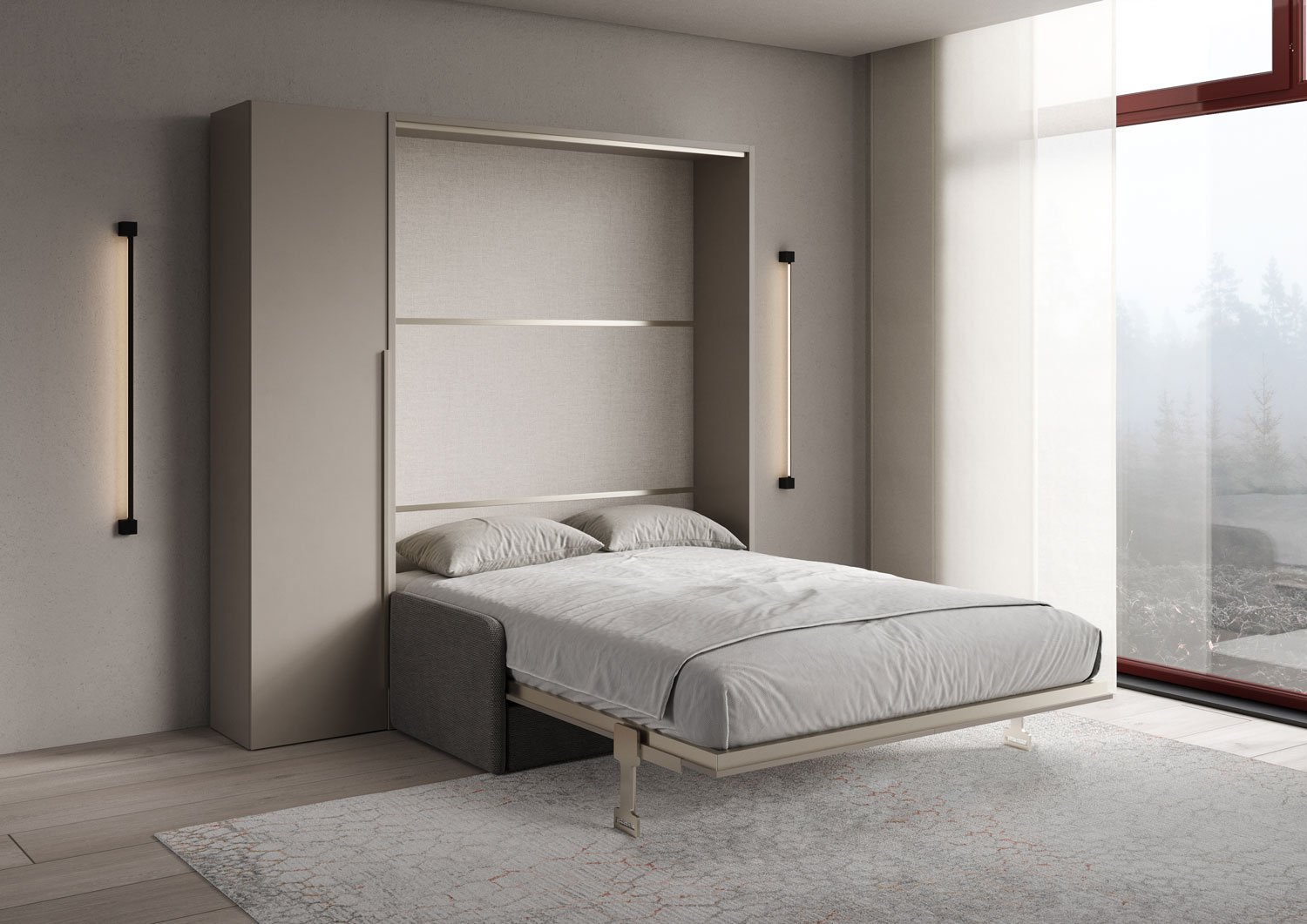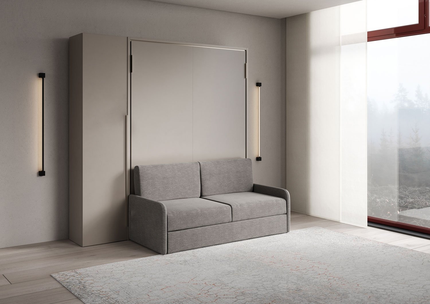 Il letto a scomparsa verticale matrimoniale Versia Sofà, con divano integrato, reinventa il concetto di spazio. Eleganza, funzionalità e design si fondono in Versia Sofà, il letto a scomparsa verticale matrimoniale che trasforma la zona giorno in zona notte in poche semplici mosse. Composizione proposta con un pratico e capiente armadio 1 anta, posizionabile a sinistra del letto, che permette di riporre al proprio interno tutto il necessario, per una camera da letto sempre in ordine. Realizzato con materiali di alta qualità, Versia è la soluzione ideale per chi desidera ottimizzare lo spazio senza rinunciare al design. Il meccanismo di apertura e chiusura, silenzioso e fluido, è progettato per garantire la massima sicurezza e facilità d’uso. Con Versia Sofà, il tuo riposo sarà un’esperienza unica e indimenticabile.
