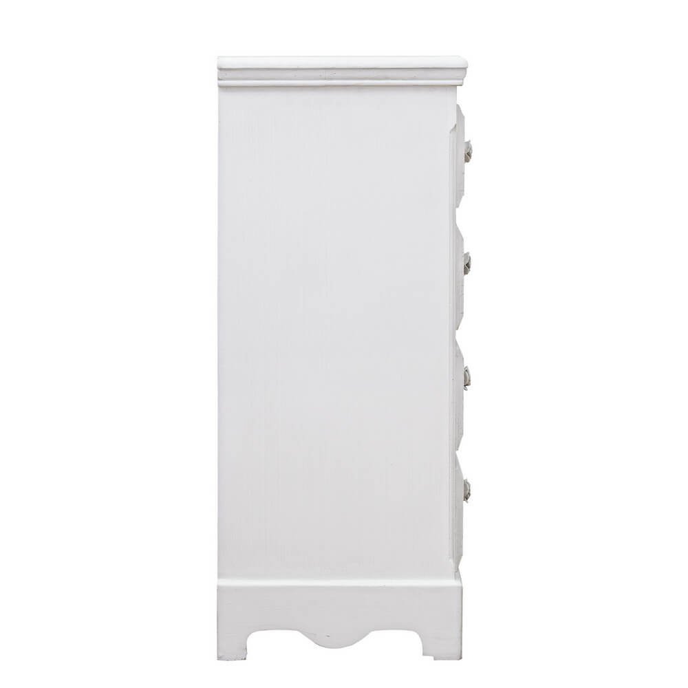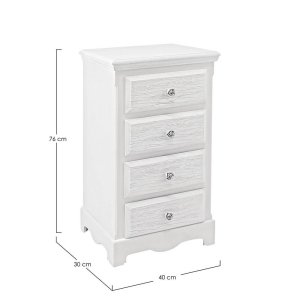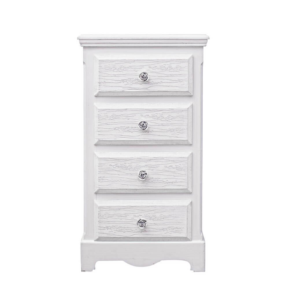La cassettiera 4 cassetti in legno bianco rustico da interno – BLAINE è un complemento d’arredo che unisce funzionalità e fascino vintage in un’unica soluzione elegante per la casa. Realizzata in MDF di qualità con una finitura bianca opaca, è impreziosita da frontali e piano con effetto decapato che ricreano il sapore autentico dello stile shabby chic. Le maniglie in poliresina a forma di piccola rosa aggiungono un tocco romantico e raffinato, facendo di questa cassettiera non solo un mobile contenitore ma anche un elemento decorativo di grande carattere. Le linee morbide del basamento sagomato e la struttura compatta la rendono ideale per ambienti come camera da letto, ingresso o bagno, dove può offrire spazio ordinato senza rinunciare allo stile. La Cassettiera 4 Cassetti Legno Bianco Rustico da Interno – BLAINE rappresenta la scelta perfetta per chi desidera arricchire la propria casa con mobili dallo charme delicato e senza tempo, evocando atmosfere calde e accoglienti.