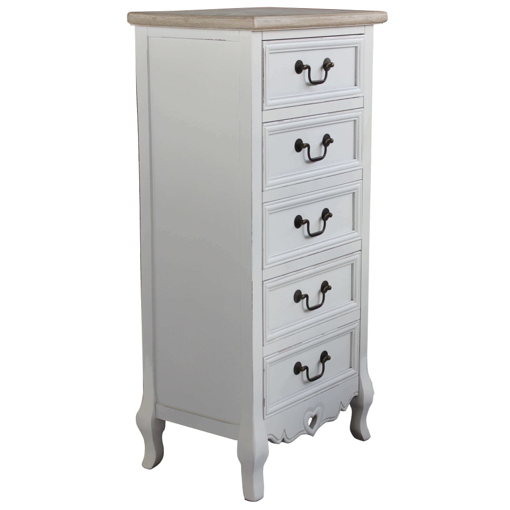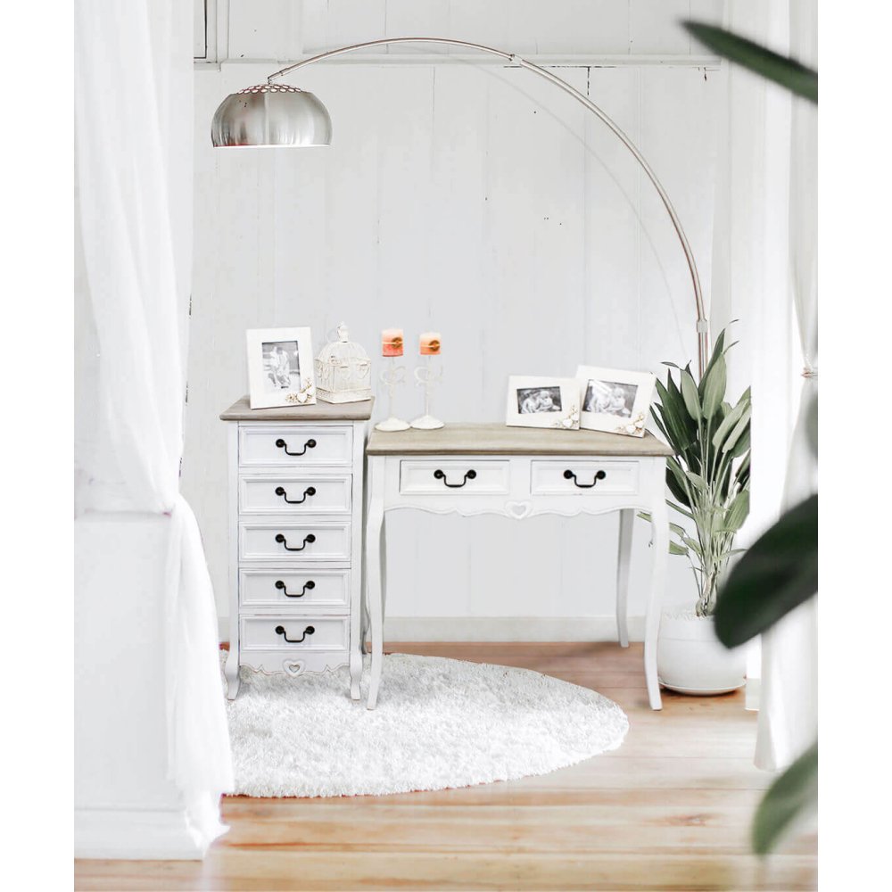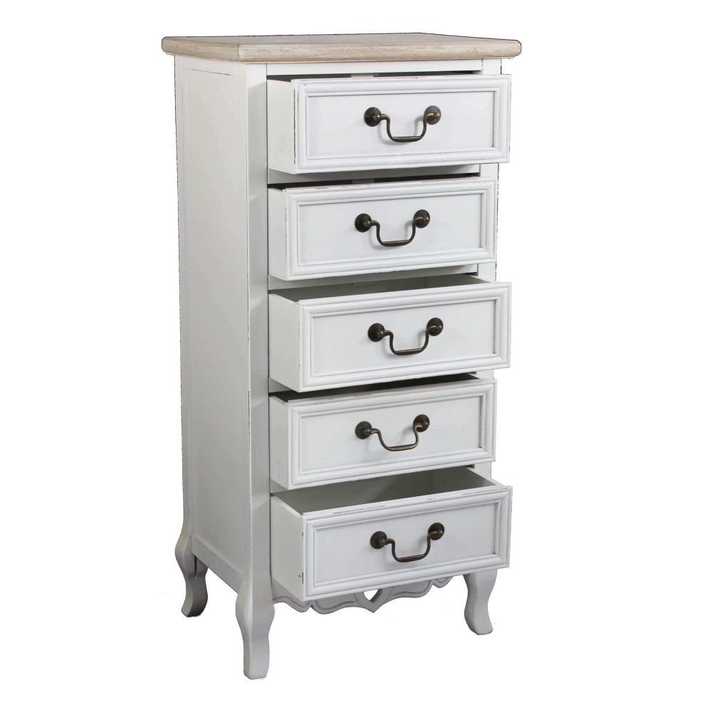 La Cassettiera 5 cassetti in Legno cm 44x29x91 – RICKY è un raffinato complemento d’arredo che unisce funzionalità e charme vintage in perfetto stile shabby chic. Realizzata con struttura in legno di paulonia e MDF impiallacciato, si distingue per la finitura bianca delicatamente anticata e per il top color nocciola che aggiunge un raffinato contrasto cromatico. I cinque cassetti offrono ampio spazio per organizzare con ordine oggetti personali, accessori o biancheria, mentre le maniglie in metallo brunito donano un tocco retrò di grande eleganza. I piedini sinuosi e le linee sagomate ne esaltano l’estetica romantica, ideale per ambienti come camera da letto, ingresso o soggiorno, dove desideri portare un accento di calore e autenticità. La cassettiera RICKY è perfetta per chi ama mobili in stile shabby chic dal sapore artigianale e dalle dimensioni compatte, senza rinunciare a funzionalità e stile. Un arredo che arricchisce l’ambiente e crea un’atmosfera accogliente e ricercata con naturale semplicità.