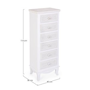 La Cassettiera 6 Cassetti Legno Bianco Rustico da Interno – CAROLINE è l’elemento d’arredo perfetto per aggiungere un tocco di eleganza romantica a qualsiasi ambiente della casa, dalla camera da letto all’ingresso. Realizzata in MDF con finitura a base d’acqua, questa cassettiera unisce estetica shabby chic e funzionalità, offrendo sei ampi cassetti ideali per organizzare indumenti, accessori o piccoli oggetti domestici. Il colore bianco, delicato e luminoso, è impreziosito da raffinati pomelli in poliresina a forma di cuore e da un motivo a rombi in rilievo sulle facciate frontali, che conferiscono un carattere dolcemente vintage. Le linee sinuose dei piedini e la finitura effetto legno sbiancato rendono la cassettiera CAROLINE una scelta perfetta per ambienti in stile rustico, provenzale o country chic. Questo mobile non solo arreda, ma racconta una storia fatta di dettagli curati e atmosfere accoglienti, elevando l’esperienza quotidiana con un tocco di poesia discreta e raffinata.