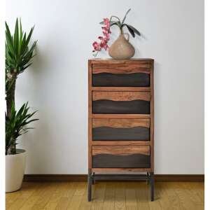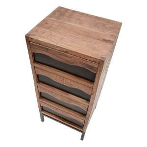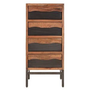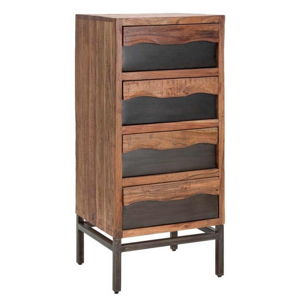 Cassettiera in legno massello di acacia con 4 cassetti. Il particolare design ondulato unitamente alle gambe in metallo nero creano un design originale ed elegante ad un pezzo comunque estremamente classico.