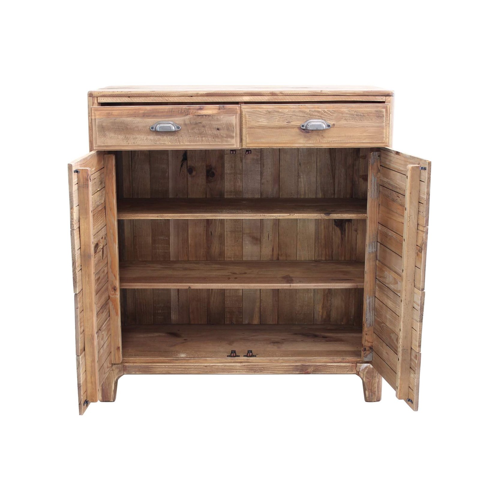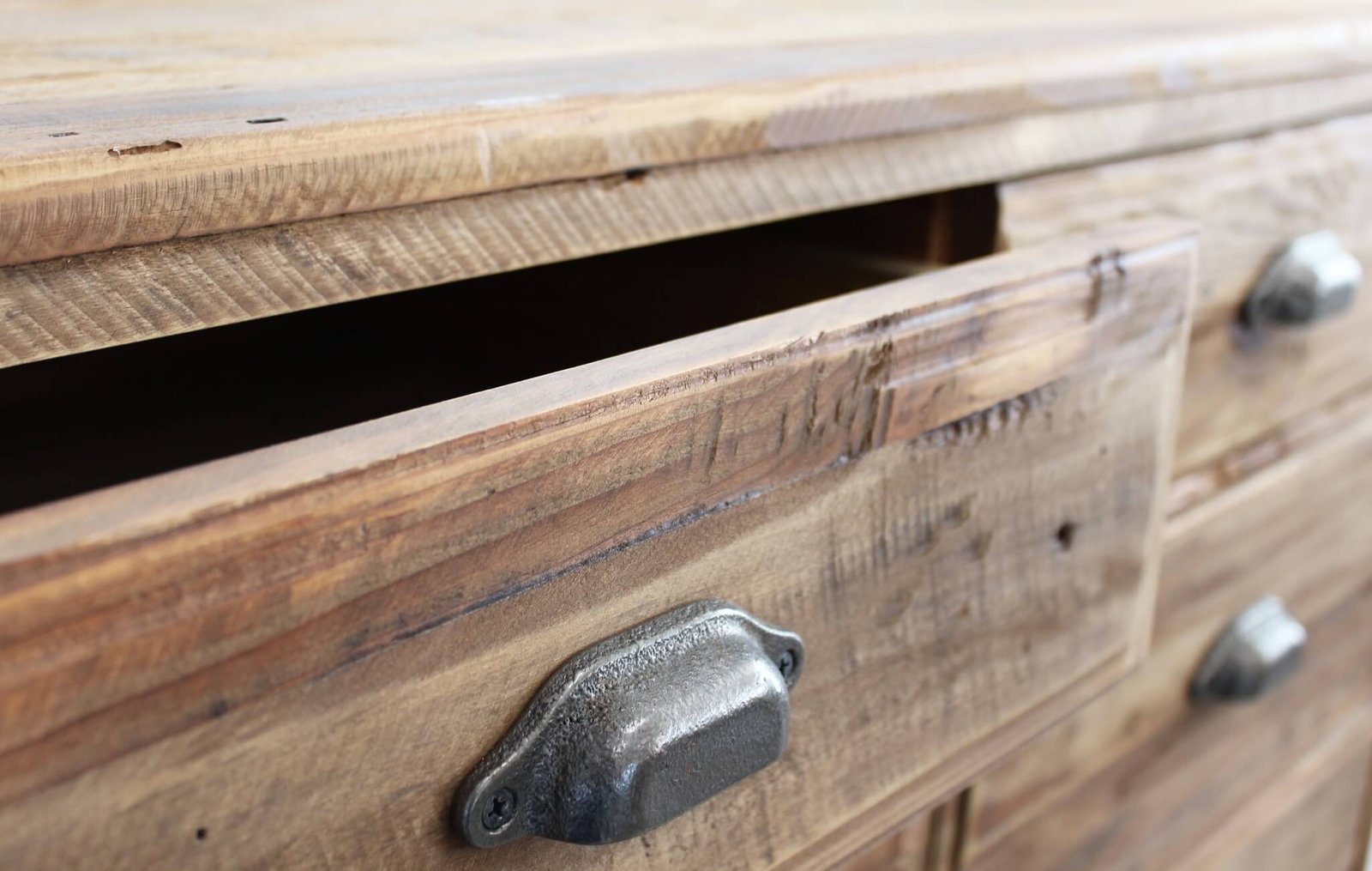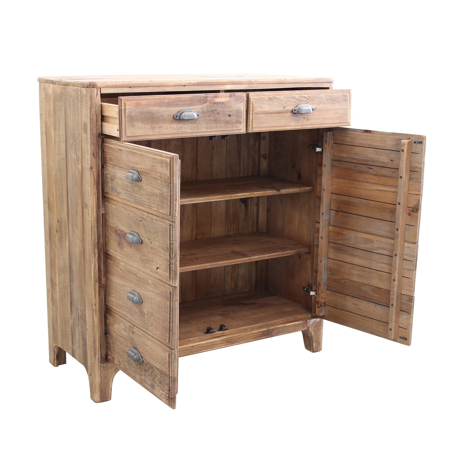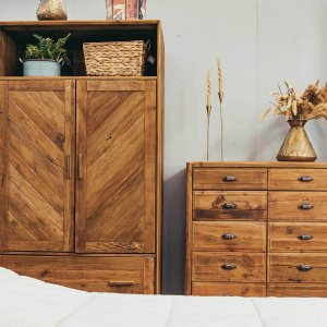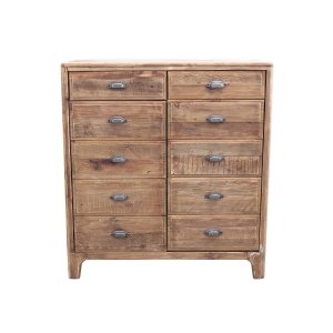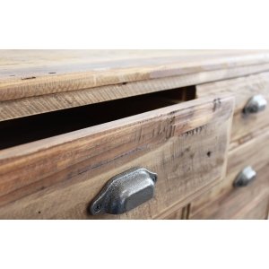 La **Cassettiera con 10 cassetti in Pino riciclato cm 105x48x113 – PINE** è un mobile dal carattere autentico e naturale, perfetto per valorizzare ambienti dallo stile rustico, industriale o country chic. Realizzata interamente in legno di pino riciclato, questa cassettiera si distingue per l’aspetto materico e vissuto, con sfumature irregolari e nodi a vista che esaltano la bellezza imperfetta del legno naturale. La finitura marrone calda e le maniglie in metallo effetto vintage conferiscono un fascino retrò ricco di personalità. I dieci capienti cassetti, abbinati a un vano a doppia anta con scaffali interni, offrono un’ampia capacità contenitiva, ideale per organizzare oggetti in qualsiasi stanza della casa, dalla zona living alla camera da letto. Le proporzioni equilibrate e i dettagli artigianali ne fanno non solo un complemento d’arredo funzionale, ma anche un pezzo distintivo che dona carattere allo spazio. La cassettiera PINE dà il meglio di sé inserita in contesti accoglienti e autentici, dove il calore del legno e l’unicità dei materiali riciclati diventano protagonisti di un ambiente ricco di stile e sostenibilità.