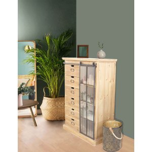 La Cassettiera con anta scorrevole in Legno Metallo cm 82×39,5×123 – BRENNAN è un complemento d’arredo dal forte carattere industriale, pensato per valorizzare ambienti dallo stile moderno, vintage o loft urbano. Realizzata in legno naturale con venature a vista e dettagli in acciaio nero opaco, racchiude un design autentico che unisce estetica e funzionalità. L’elemento distintivo è l’anta scorrevole in metallo con griglia a vista, montata su binario superiore, che permette di alternare l’accesso a una colonna di dieci cassetti e a pratici ripiani a giorno. Questa struttura solida e al tempo stesso raffinata offre una soluzione perfetta per organizzare oggetti ed esporre accessori in soggiorno, studio o ingresso, mantenendo uno stile coerente e ricercato. Le tonalità calde del legno marrone, bilanciate dall’eleganza urbana del nero, creano un equilibrio visivo di grande impatto. La cassettiera BRENNAN non è solo un mobile contenitore, ma una vera dichiarazione di stile, ideale per chi ama ambienti accoglienti con un’anima industrial chic.