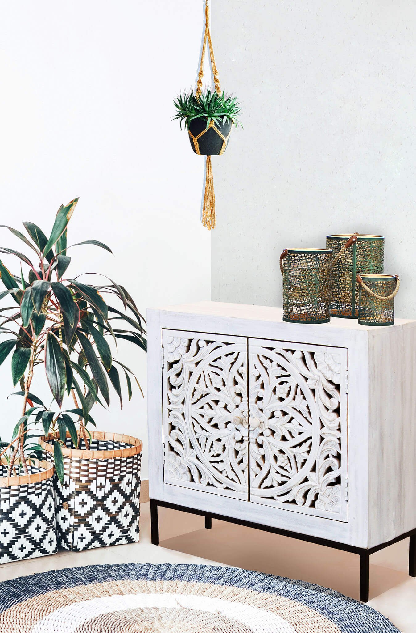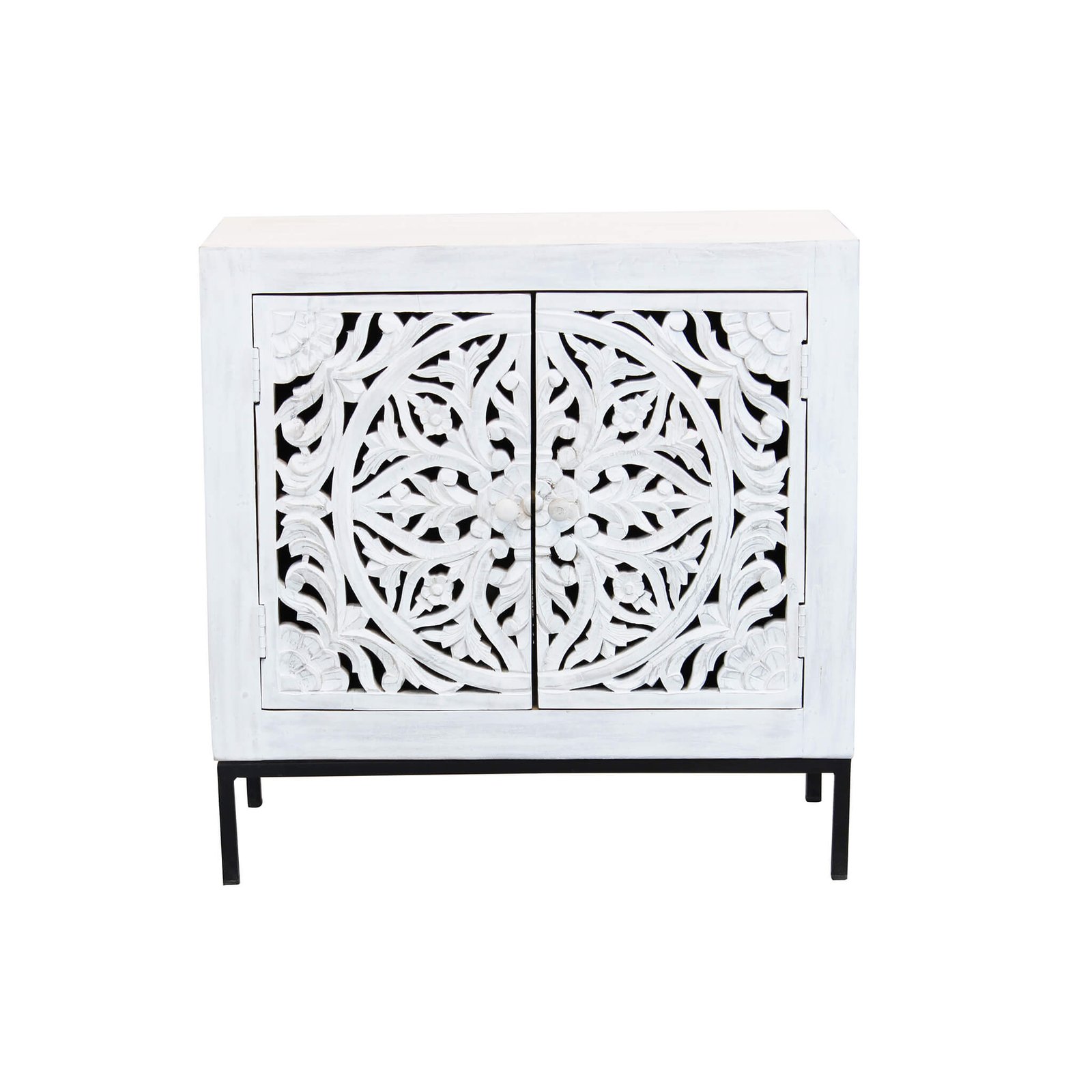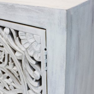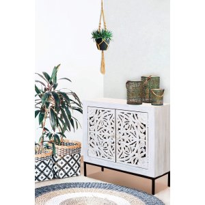 La Cassettiera con decoro 2 ante in Legno Metallo cm 80x40x80 – KONNOR è un complemento d’arredo che unisce design ricercato e funzionalità in uno stile contemporaneo con richiami etnici. Realizzata in legno di mango con struttura in resistente acciaio, si distingue per il decoro intagliato a motivo organico sulle ante, che aggiunge un tocco artistico e artigianale. Il contrasto armonioso tra il bianco sbiancato della struttura esterna e le venature calde del legno naturale crea un effetto visivo affascinante, perfetto per aggiungere personalità a soggiorni, ingressi o camere dal gusto moderno, industriale o boho. Le dimensioni compatte la rendono versatile anche in spazi contenuti, mentre l’interni spaziosi a due ripiani assicurano ordine e praticità. Il basamento in metallo nero solleva la struttura conferendole leggerezza ed eleganza. La cassettiera KONNOR è pensata per chi cerca mobili in legno dal forte impatto estetico senza rinunciare alla qualità dei materiali e alla funzionalità quotidiana. Ideale in ambienti luminosi o in contrasto con tonalità neutre, esprime il meglio di sé in atmosfere rilassate e accoglienti, valorizzando l’arredo con un carattere deciso ma equilibrato.
