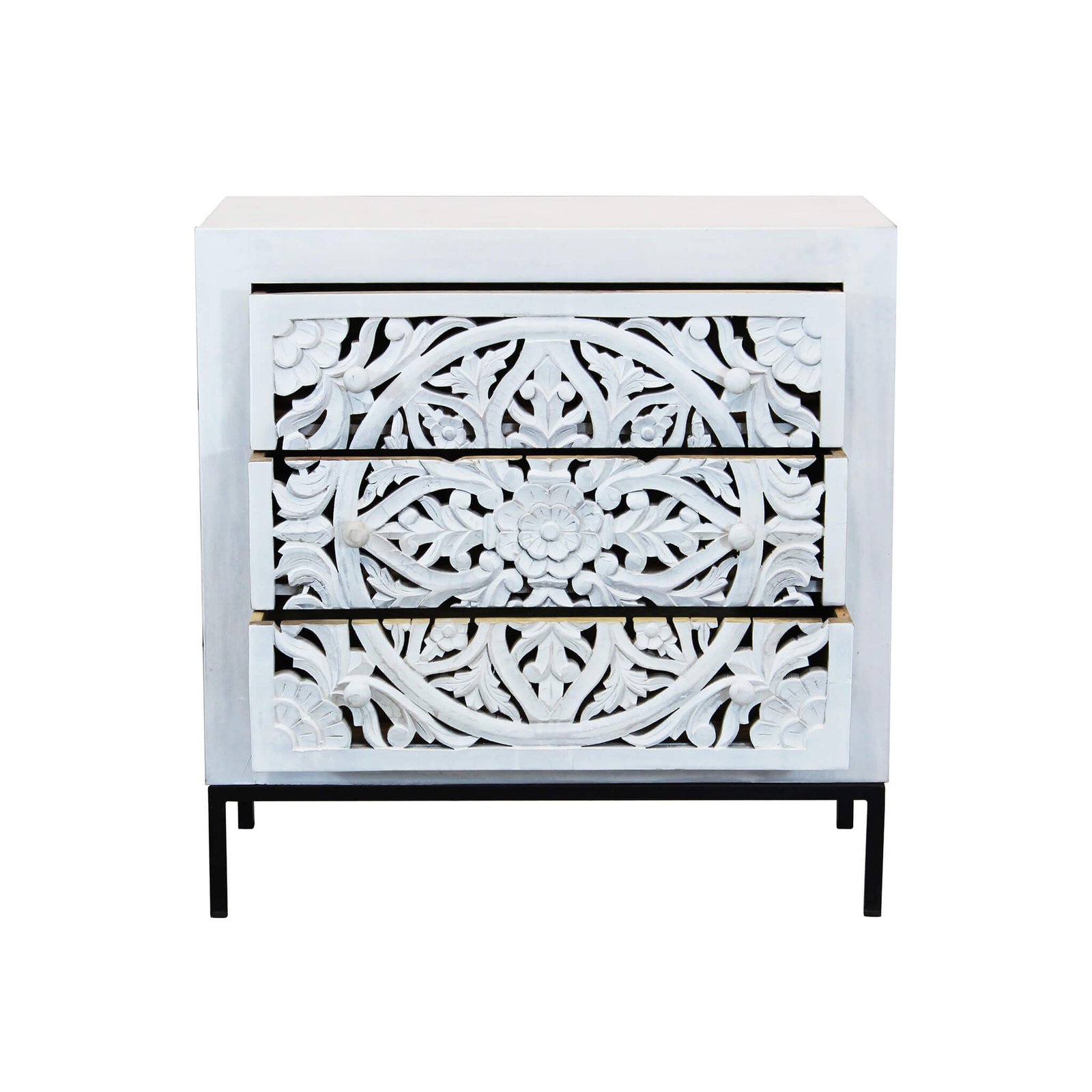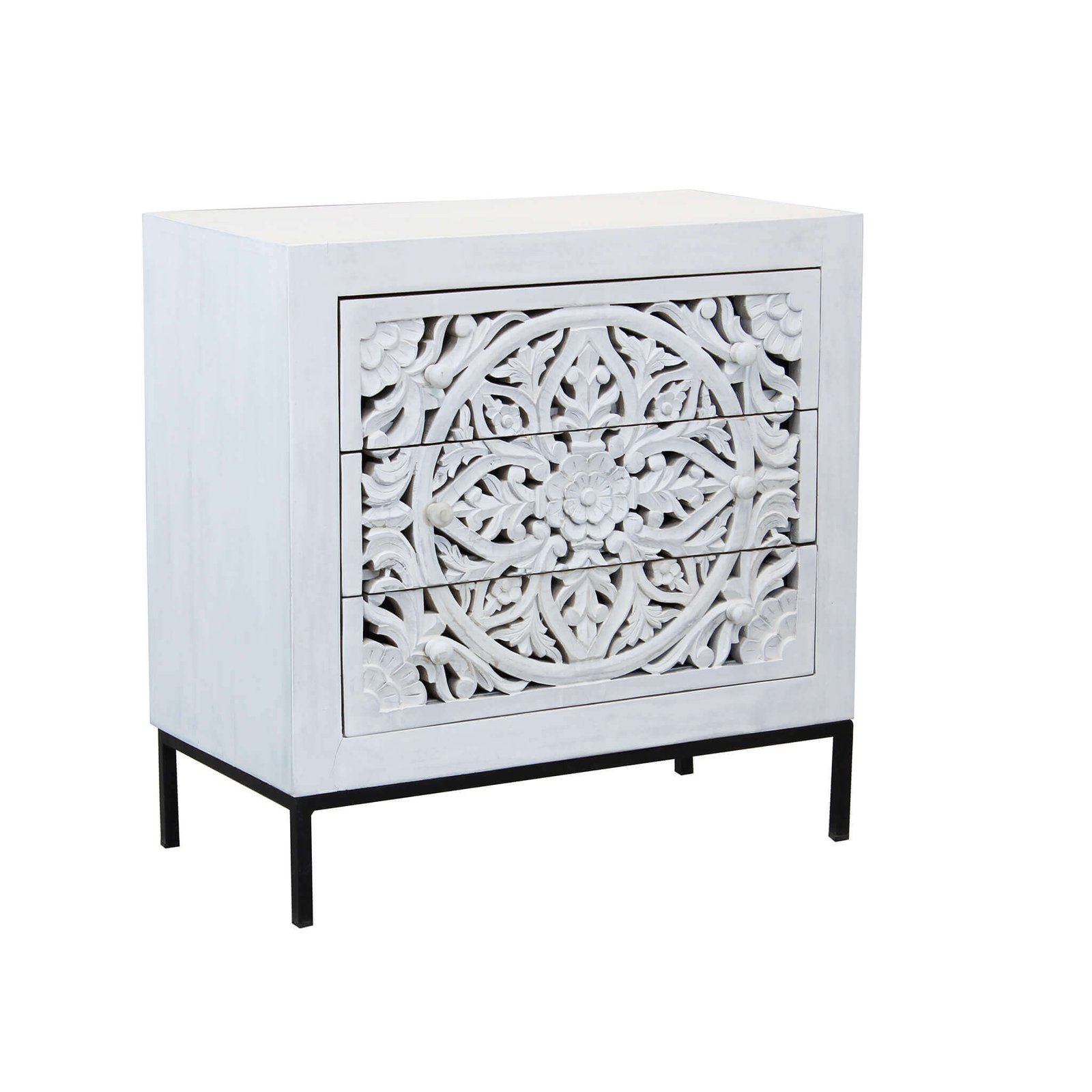 La **Cassettiera con decoro 3 cassetti in Legno Metallo cm 80x40x80 – KONNOR** è un pezzo d’arredo che unisce in modo armonioso eleganza artigianale e solidità strutturale. Realizzata in legno di mango e acciaio, questa cassettiera si distingue per i frontali intagliati a mano con un raffinato motivo floreale sbiancato che richiama atmosfere etniche e suggestioni boho chic. La struttura in ferro verniciato nero dona un tocco industriale e contemporaneo, creando un contrasto visivo di grande impatto con il calore e le venature naturali del legno. Il design compatto (cm 80 x 40 x 80 h) la rende ideale per spazi come soggiorni, camere da letto o ingressi dove si ricerca praticità senza rinunciare al carattere estetico. I tre ampi cassetti offrono un’organizzazione funzionale per oggetti personali o biancheria, mantenendo l’ambiente ordinato con stile. La cassettiera KONNOR si inserisce perfettamente in contesti arredati con gusto rustico, shabby chic o industrial, regalando un effetto decorativo unico che valorizza l’intero ambiente con un tocco artigianale autentico. Un elemento d’arredo che conquista per la sua personalità e arricchisce ogni spazio con eleganza e funzionalità.
