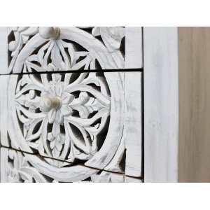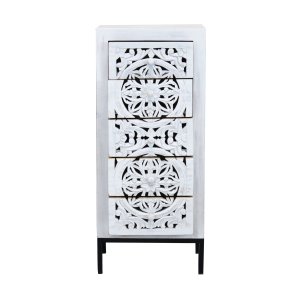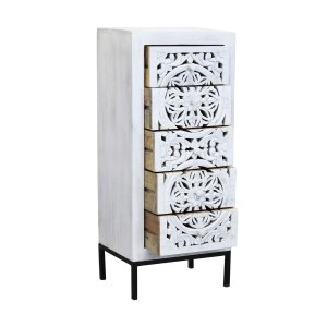 La **Cassettiera con decoro 5 cassetti in Legno Metallo cm 45x35x105 – KONNOR** è un autentico elemento d’arredo che unisce eleganza artigianale e materiali di pregio per arricchire con stile ogni ambiente della casa. Realizzata in legno di mango massiccio e sostenuta da una solida struttura in acciaio, questa cassettiera si distingue per i raffinati cassetti decorati con intagli floreali a effetto sbiancato, che donano un tocco etnico e vintage al design complessivo. Il contrasto armonioso tra il bianco decapato delle decorazioni e le tonalità naturali del legno marrone crea un effetto visivo caldo e accogliente, mentre le linee sobrie e la base in metallo nero conferiscono stabilità e un accento moderno e minimalista. Perfetta per ambienti living, camere da letto o ingressi, la cassettiera KONNOR offre non solo un alto valore estetico, ma anche una funzionalità quotidiana grazie ai suoi cinque spaziosi cassetti, ideali per organizzare oggetti con ordine e stile. Un mobile decorativo che si integra alla perfezione con arredi boho chic, industrial, oppure rustici, e che valorizza gli spazi domestici trasmettendo personalità e carattere.