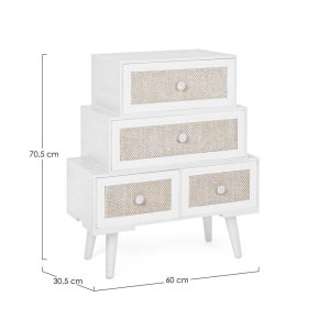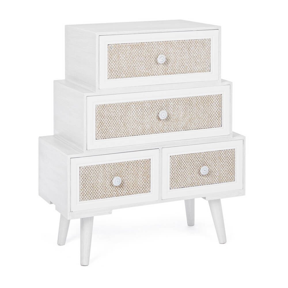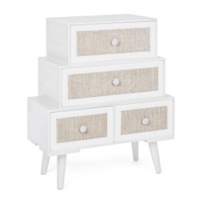 La Cassettiera Legno Bianco Boho da Interno – MONIQUE è un raffinato complemento d’arredo che unisce estetica boho chic e funzionalità, ideale per arricchire con eleganza ogni ambiente della casa. La struttura in MDF verniciato con finitura a base d’acqua garantisce un aspetto naturale e luminoso, mentre i cassetti sfalsati, rivestiti in un delicato tessuto di cotone e lino intrecciato, creano un effetto visivo caldo e materico. I pomelli in metallo con finitura leggera e i piedini affusolati da assemblare conferiscono leggerezza alla composizione e un tocco retrò contemporaneo. I toni chiari del bianco e del beige rendono la cassettiera MONIQUE perfetta per camere da letto, ingressi o zone living in stile nordico, etnico o shabby. Grazie al suo design compatto ma capiente, offre una pratica soluzione salvaspazio per riporre oggetti quotidiani con stile. Questa cassettiera si distingue per i suoi dettagli armoniosi e trasmette una sensazione di accoglienza e serenità, valorizzando al meglio atmosfere rilassanti e ambienti curati.