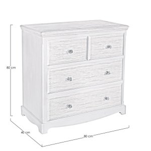 La Cassettiera Legno Bianco Rustica da Interno – BLAINE è un complemento d’arredo raffinato, pensato per impreziosire gli ambienti con uno stile country chic dal fascino senza tempo. Realizzata in MDF con una solida struttura in legno, si distingue per la sua elegante finitura bianca opaca e i frontali dei cassetti con effetto decapato, che ne esaltano l’autenticità artigianale e le regalano un irresistibile aspetto vissuto. Le maniglie in poliresina, lavorate con un design floreale scolpito, aggiungono un tocco romantico e distintivo, perfettamente in linea con l’estetica shabby e provenzale. Questa cassettiera è ideale per arredare camere da letto, ingressi o soggiorni, offrendo quattro ampi cassetti in cui riporre con ordine biancheria, accessori o piccoli oggetti. La Cassettiera BLAINE esprime al meglio il suo valore in contesti domestici dal gusto rilassato e accogliente, dove materiali naturali e colori tenui contribuiscono a creare atmosfere armoniose e luminose. Perfetta per chi desidera unire stile e funzionalità con un arredo che racconta storie di charme e semplicità.