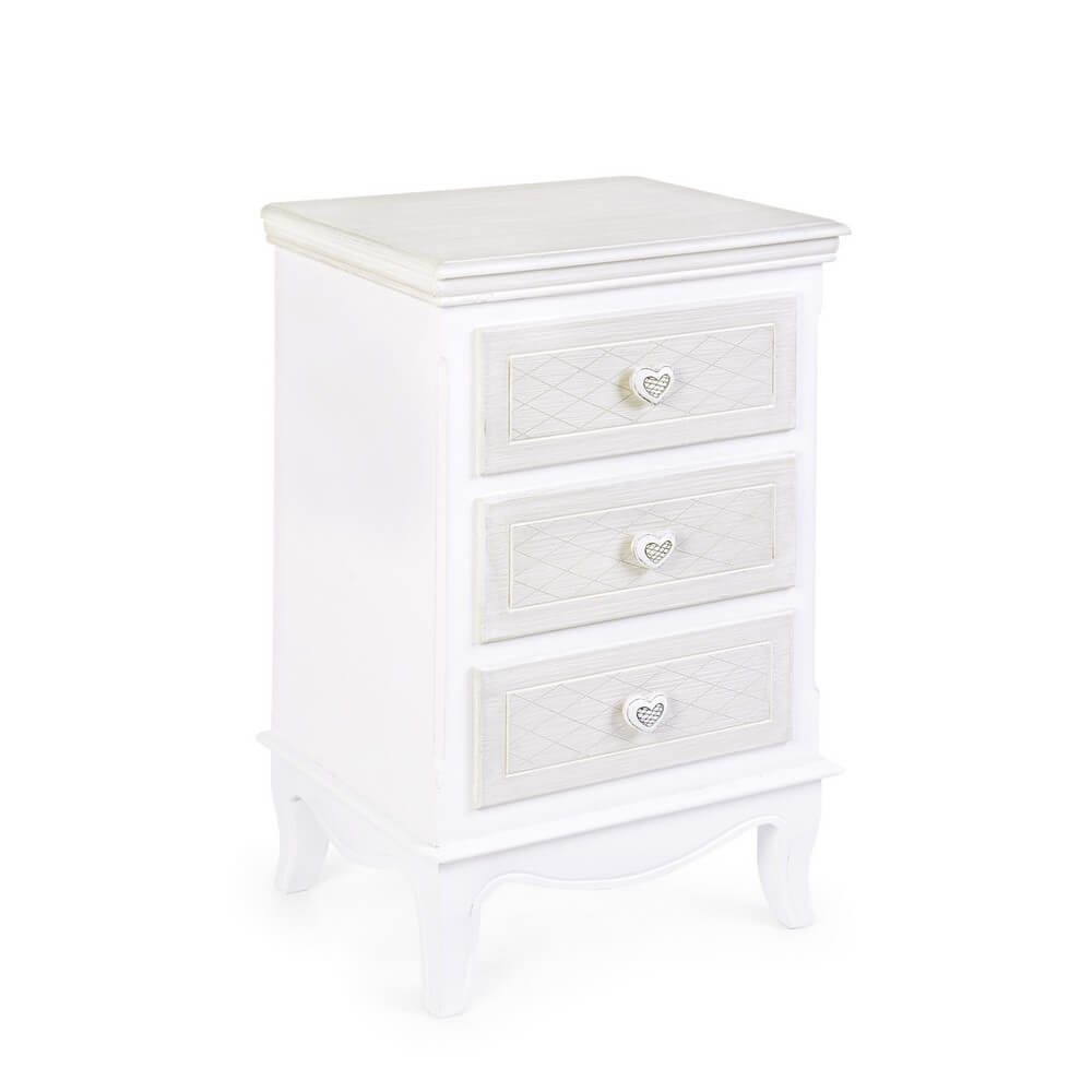 La Cassettiera Legno Bianco Stile Romantico da Interno – CAROLINE è un raffinato complemento d’arredo che unisce funzionalità e charme in un perfetto equilibrio dal gusto delicato e femminile. Ideale per aggiungere un tocco romantico alla camera da letto, all’ingresso o a un angolo relax della casa, questo mobile si distingue per la finitura bianca opaca a base d’acqua che valorizza le forme classiche e le linee sinuose della struttura. Realizzata in robusto MDF, garantisce durata nel tempo e stabilità, mentre i pomelli in poliresina a forma di cuore, impreziositi da un piccolo motivo traforato, aggiungono un dettaglio decorativo unico e subito riconoscibile. I tre cassetti frontali presentano una lavorazione a losanghe effetto legno sbiancato che crea un armonioso contrasto cromatico con il bianco puro della cornice. Lo stile romantico e leggermente shabby chic rende la cassettiera CAROLINE perfetta per ambienti ispirati alla dolcezza del country francese o alla semplicità elegante dello stile nordico. La sua presenza dona calore e charme all’ambiente, trasformando anche uno spazio funzionale in un piccolo angolo di raffinata bellezza.