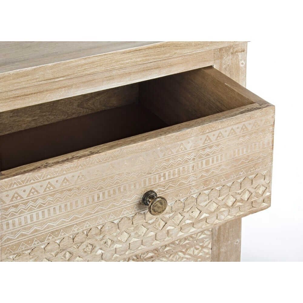La Cassettiera Legno Naturale Boho da Interno – LENA unisce l’eleganza dell’arredo boho con la solidità dei materiali naturali, diventando il pezzo d’accento ideale per chi desidera portare calore e personalità nella propria casa. Realizzata in pregiato legno di mango, questa cassettiera si distingue per le sue raffinate decorazioni intarsiate a mano sui frontali dei cassetti, che donano movimento e carattere all’intera struttura. La finitura chiara, dalle delicate sfumature naturali, esalta le venature del legno e si abbina facilmente a interni in stile etnico, scandinavo o shabby chic. I pomelli in ottone aggiungono un dettaglio prezioso e retrò, mentre lo schienale e il fondo dei cassetti in MDF garantiscono leggerezza e praticità d’uso. La cassettiera LENA, con i suoi cinque ampi cassetti, è perfetta per organizzare con stile ambienti come la camera da letto, l’ingresso o la zona living. La qualità artigianale, l’autenticità dei materiali e il design ricercato la rendono non solo un mobile funzionale, ma anche un vero elemento decorativo capace di creare un’atmosfera calda, rilassata e accogliente.