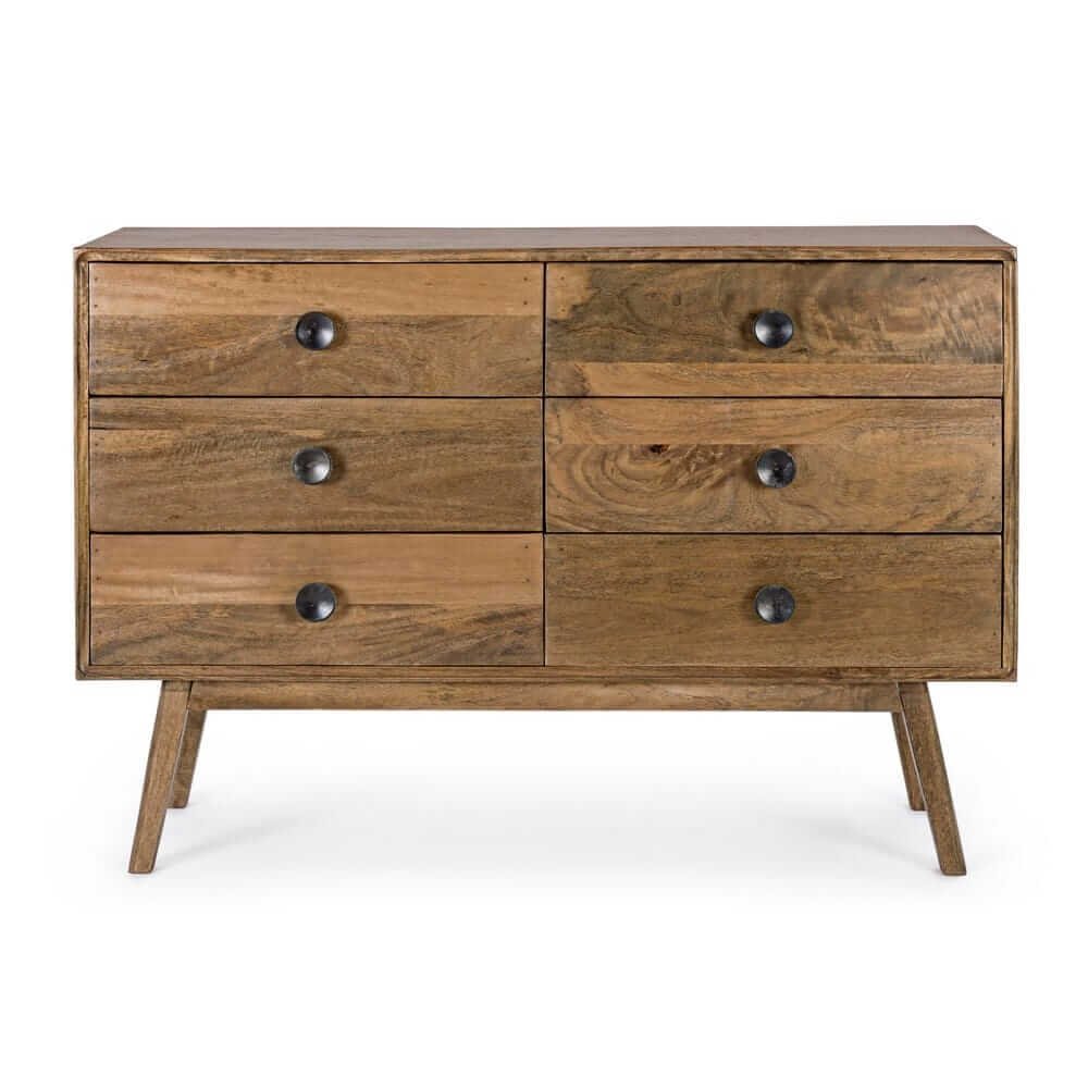 La Cassettiera Legno Naturale Rustica da Interno – EVANDER è un’elegante aggiunta d’arredo che coniuga il fascino senza tempo dello stile rustico con linee sobrie e contemporanee. Realizzata in legno massello di mango, valorizzato da una finitura a base d’acqua che ne esalta le venature naturali, questa cassettiera si distingue per l’aspetto caldo e autentico, ideale per ambienti living dal gusto naturale o per camere dal sapore nordico e accogliente. La struttura solida e le gambe leggermente inclinate, da assemblare, conferiscono stabilità e un tocco retrò ispirato al design scandinavo. I sei ampi cassetti, impreziositi da pomelli in acciaio scuro, offrono uno spazio contenitivo pratico e organizzato, perfetto per custodire biancheria, accessori o piccoli oggetti del quotidiano. Il retro in compensato leggero garantisce leggerezza senza compromettere la robustezza. La Cassettiera EVANDER è pensata per chi desidera un mobile funzionale ma anche distintivo, che riesca a dare carattere all’ambiente con la calda materia naturale del legno e un’estetica essenziale. Ideale in salotto, in camera da letto o in ingresso, regala una sensazione di ordine e armonia all’intera casa.