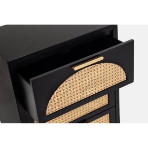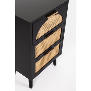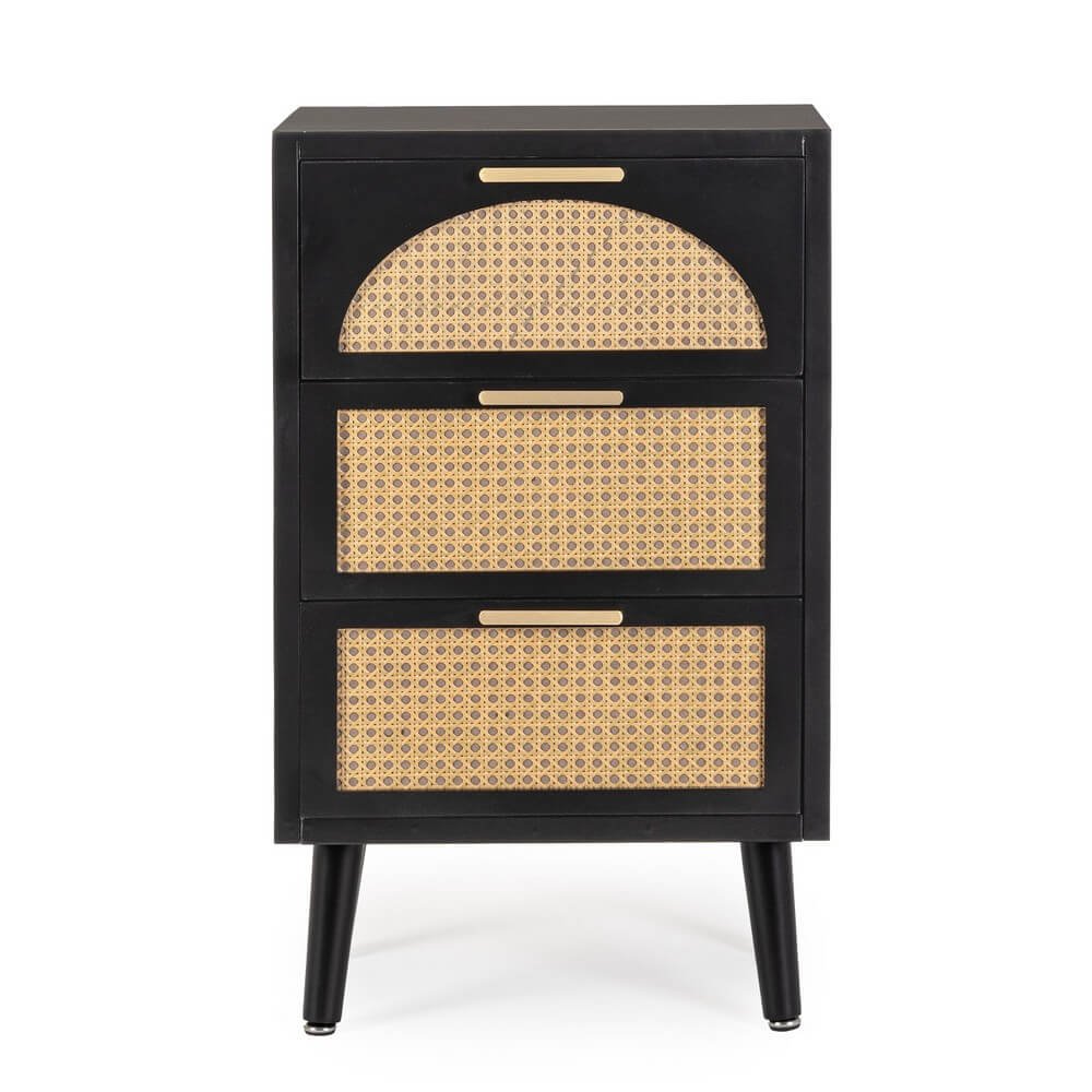 La Cassettiera Legno Nero Stile Boho da Interno – JOSIE è un raffinato complemento d’arredo che unisce funzionalità e personalità in uno stile boho contemporaneo. La struttura solida in MDF dalle linee pulite è impreziosita da tre cassetti frontali con inserti in rattan naturale, che aggiungono un tocco etnico e artigianale al mobile, creando un piacevole contrasto con la finitura nera opaca. Le gambe affusolate in legno di pino e le eleganti maniglie in acciaio donano al design leggerezza e raffinatezza, perfette per valorizzare ambienti domestici come camera da letto, soggiorno o ingresso. La cassettiera JOSIE non è solo bella da vedere, ma anche pratica: offre un’ottima capacità contenitiva per mantenere in ordine ogni spazio della casa, con un’estetica che scalda l’atmosfera senza rinunciare all’eleganza. Ideale per chi cerca mobili in legno con stile boho chic, si distingue per l’equilibrio tra materiali naturali e dettagli moderni, facendo della semplicità un elemento di charme. Collocata in ambienti luminosi o abbinata ad arredi in fibra naturale, la cassettiera JOSIE dona carattere e un senso di accoglienza autentica.