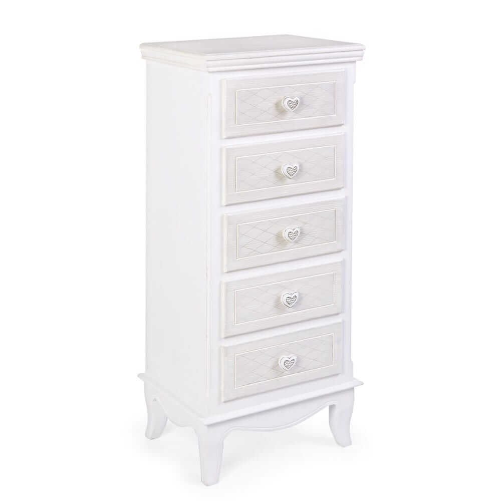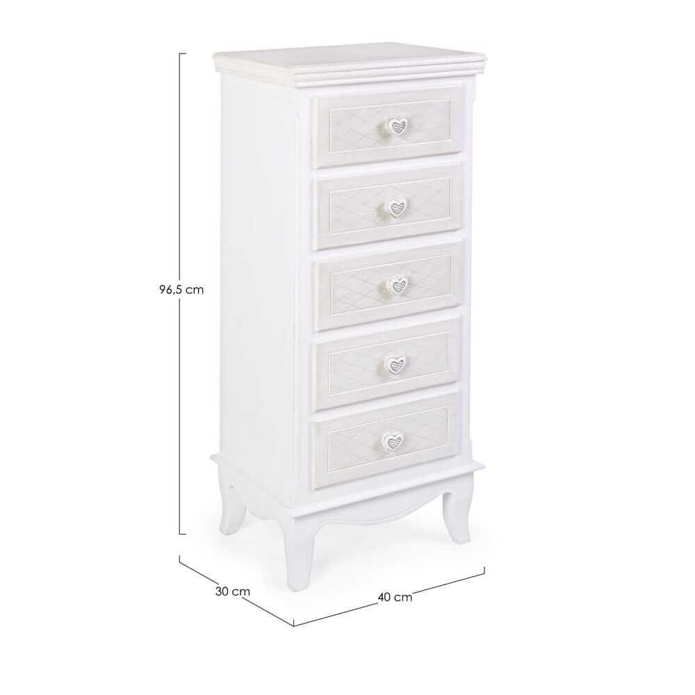 La Cassettiera MDF Impiallacciato Bianca Stile Shabby da Interno – ADELINE è un raffinato complemento d’arredo pensato per valorizzare gli spazi con eleganza e delicatezza. Realizzata in resistente MDF impiallacciato con finitura a base d’acqua, questa cassettiera combina leggerezza visiva e solidità strutturale. Il design inconfondibilmente shabby chic si esprime nei toni bianco opaco leggermente decapati, nei cassetti frontali decorati con una texture a losanghe e nei pomelli in poliresina a forma di cuore traforato, che aggiungono un tocco romantico e artigianale. Le gambe sagomate e il bordo superiore lavorato completano con grazia la linea vintage del mobile. La cassettiera ADELINE è perfetta per ambienti come camera da letto, ingresso o zona living, offrendo funzionalità con i suoi cinque spaziosi cassetti, ideali per organizzare biancheria, accessori o piccoli oggetti personali. La sua presenza valorizza anche ambienti moderni con dettagli retrò, creando atmosfere accoglienti e curate. La scelta ideale per chi cerca stile senza rinunciare alla praticità quotidiana.
