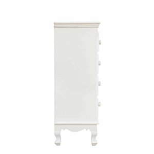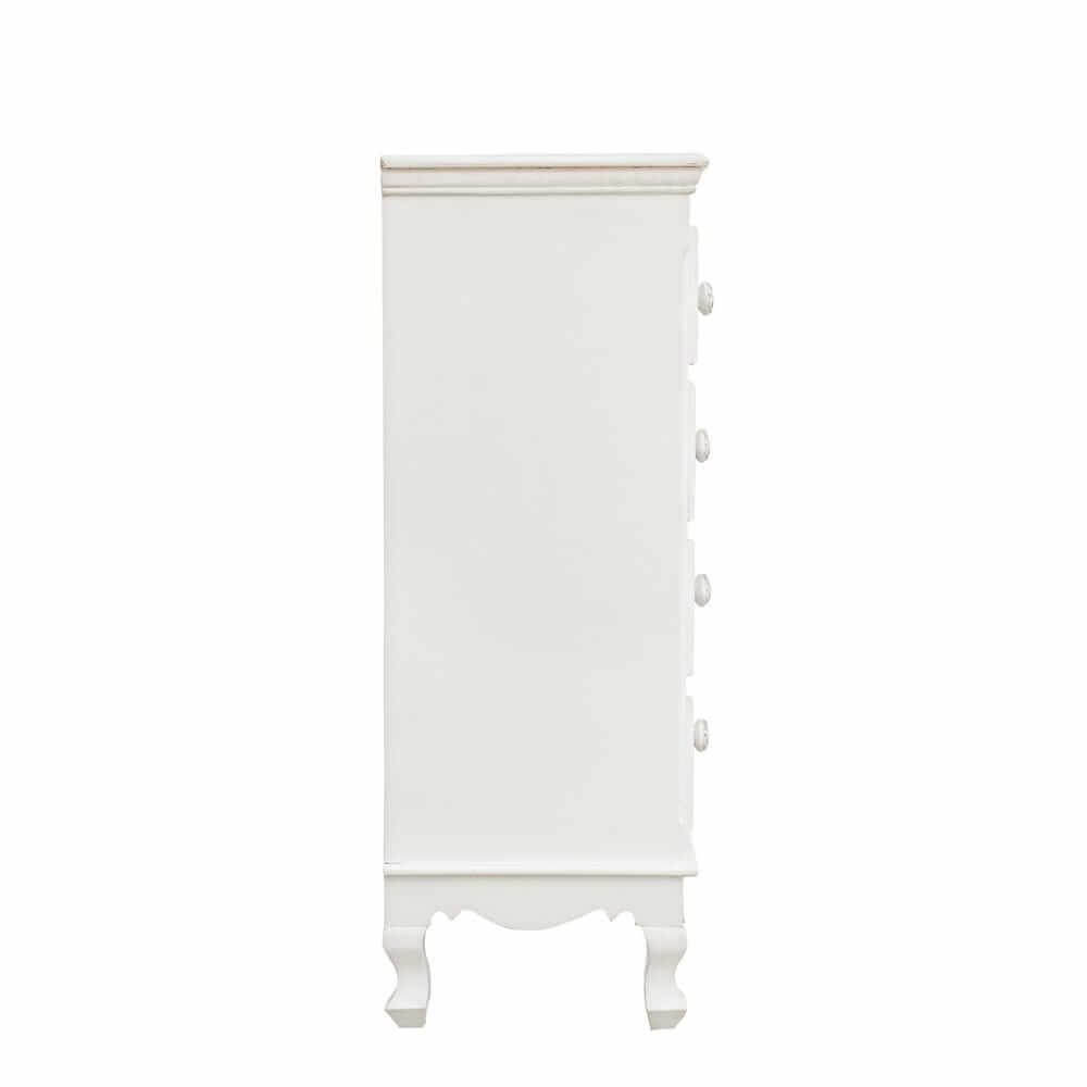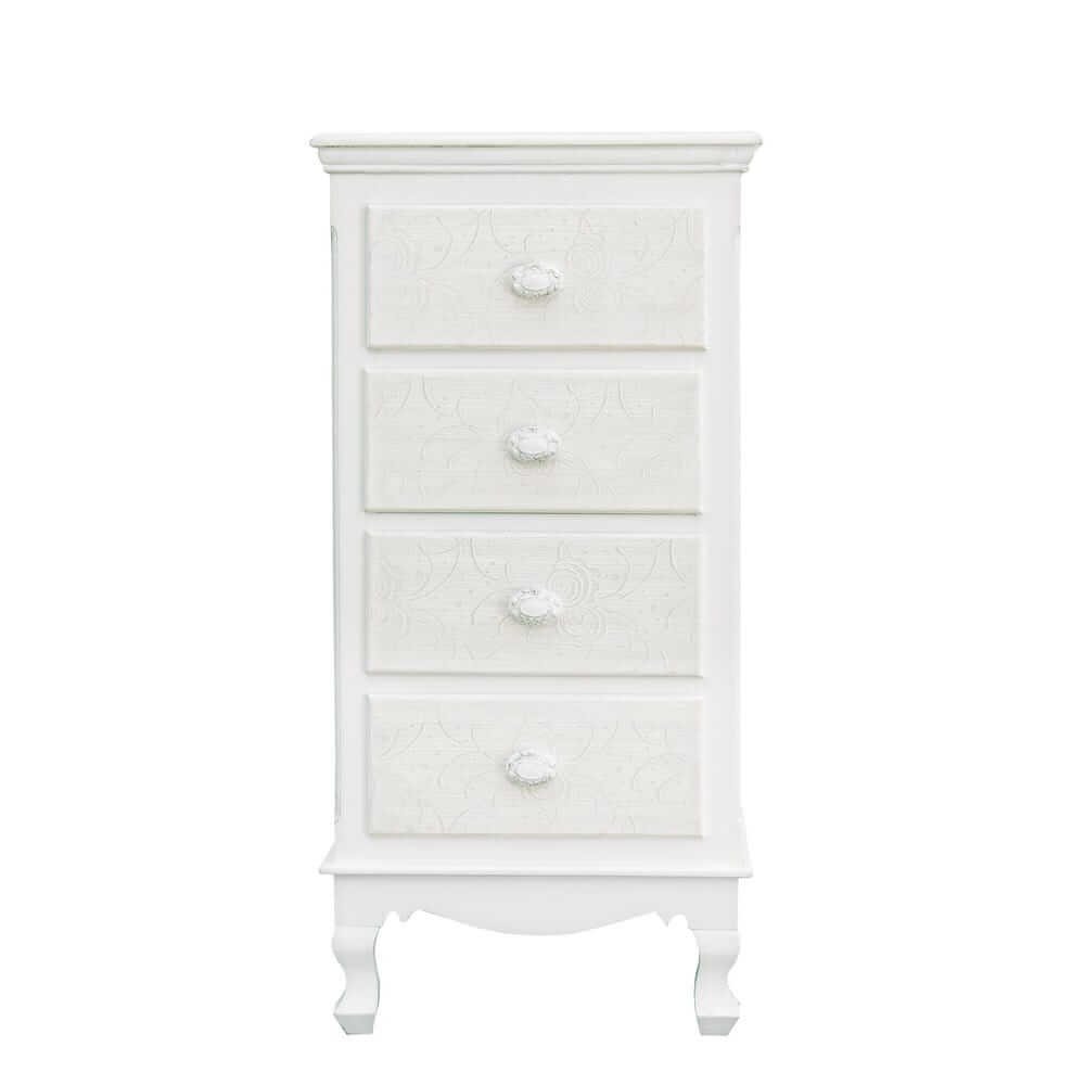 La Cassettiera MDF Impiallacciato Bianco Stile Classico da Interno – ALBINE è un complemento d’arredo che unisce eleganza senza tempo e funzionalità quotidiana. Realizzata in MDF impiallacciato, si distingue per la sua struttura solida e rifinita con vernice opaca a base d’acqua, che dona al mobile una delicata finitura satinata, perfetta per ambienti interni dallo stile classico o romantico. La cassettiera presenta quattro cassetti decorati con raffinati motivi floreali intarsiati sui frontali, un elemento visivo distintivo che arricchisce l’estetica dell’arredo mantenendo un tono sobrio ed elegante. Le maniglie in poliresina, finemente lavorate, aggiungono un tocco di charme rétro, mentre il colore bianco amplifica la luminosità dello spazio, rendendola ideale per camere da letto, ingressi o zone giorno arredate con gusto. Il design slanciato e le gambe sinuose ne esaltano ulteriormente l’aspetto sofisticato, permettendo di valorizzare anche ambienti di dimensioni contenute. La cassettiera ALBINE esprime al meglio il suo valore in contesti accoglienti e curati, dove ogni dettaglio racconta una storia di stile e raffinatezza.