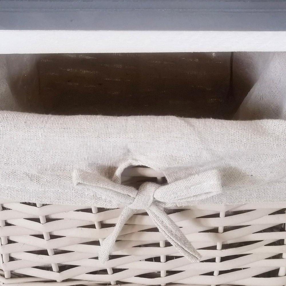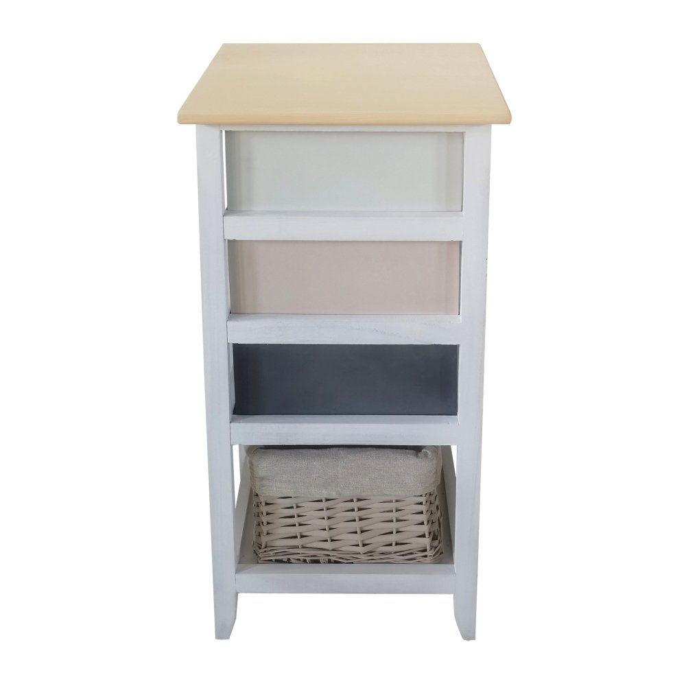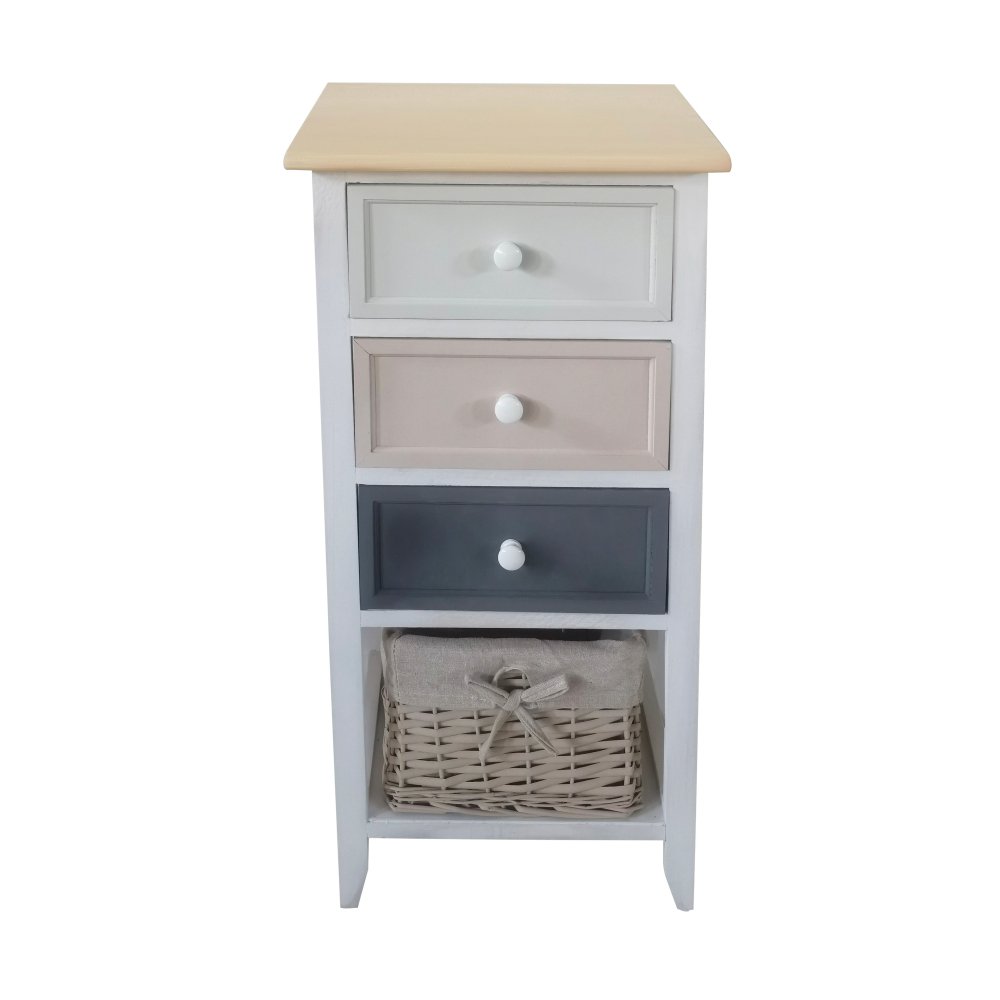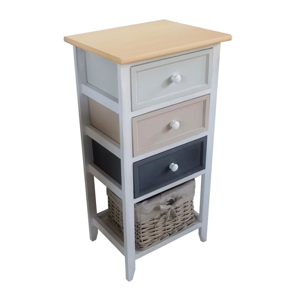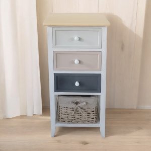 Il prodotto “Cassettiera mobiletto per bagno camera – DAMON” è la scelta ideale per chi desidera unire funzionalità e raffinatezza in uno stile shabby chic dal fascino senza tempo. Realizzata in legno e MDF impiallacciato, questa cassettiera compatta ma capiente (dimensioni cm 35 l x 28 p x 73 h) si distingue per i suoi quattro cassetti disposti in una gradevole sfumatura cromatica che spazia dal bianco al nero passando per toni neutri come il grigio e il marrone chiaro. Ogni cassetto presenta un pomello in tinta e finiture opache che ne esaltano lo stile delicatamente vissuto, ideale per ambienti come bagni, camere da letto o hotel dal gusto romantico e curato. Il dettaglio del cesto intrecciato alla base aggiunge un tocco artigianale e offre uno spazio extra per riporre gli oggetti quotidiani. La cassettiera DAMON si integra armoniosamente in contesti arredati con charm provenzale o country chic, offrendo non solo estetica, ma anche praticità organizzativa grazie alla sua struttura fissa e stabile. Perfetta per chi cerca un mobile salvaspazio elegante, esprime il suo massimo valore in ambienti rilassanti dove ordine, stile e calore si fondono in un’unica esperienza d’arredo.