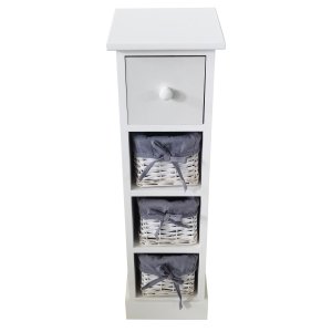 La cassettiera mobiletto per bagno camera FENRIS è la soluzione d’arredo ideale per chi cerca funzionalità e stile in spazi contenuti. Con le sue dimensioni compatte di 21x21x70 cm, si inserisce armoniosamente sia in ambienti domestici come bagno o camera da letto, sia in contesti ricettivi come hotel di charme. Realizzata in legno e MDF impiallacciato di alta qualità, presenta un’elegante struttura bianca affiancata da cassetti in tessuto grigio inseriti in cestini di vimini verniciati, che ne enfatizzano lo stile shabby chic. L’alternanza dei materiali e dei colori crea un gradevole contrasto visivo, donando carattere e raffinatezza a qualsiasi spazio. Il mobiletto FENRIS non solo arricchisce l’arredamento con un tocco romantico e senza tempo, ma offre anche una pratica organizzazione grazie ai suoi quattro capienti cassetti. Perfetto per riporre piccoli oggetti, accessori da bagno o biancheria, trasmette una sensazione di ordine e accoglienza. In un hotel o in casa, questo mobile trasmette quella calda eleganza che rende ogni ambiente più curato e personale.