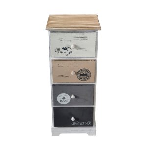 Il prodotto “Cassettiera mobiletto per bagno camera – ICARUS” è un elegante elemento d’arredo dallo stile shabby chic, perfettamente pensato per chi desidera un tocco di calda autenticità in ambienti come hotel, camere da letto o bagni. Realizzata in legno e MDF impiallacciato, questa cassettiera a 4 cassetti si distingue per la finitura decapata e le delicate sfumature nei toni del bianco, nero, marrone e grigio, che si combinano armoniosamente per creare un’estetica vissuta e romantica. Le decorazioni grafiche sui frontali dei cassetti, ognuno diverso dall’altro, aggiungono un fascino rustico e personalizzato, mentre le dimensioni compatte (29 cm di larghezza, 25 cm di profondità, 72 cm di altezza) la rendono ideale anche per spazi contenuti. Il mobiletto ICARUS coniuga funzionalità e stile, offrendo una soluzione pratica per organizzare piccoli oggetti quotidiani, senza rinunciare all’impatto decorativo. La cassettiera ICARUS è perfetta per impreziosire un angolo della casa o valorizzare l’ambiente di un hotel con charme discreto e accogliente.