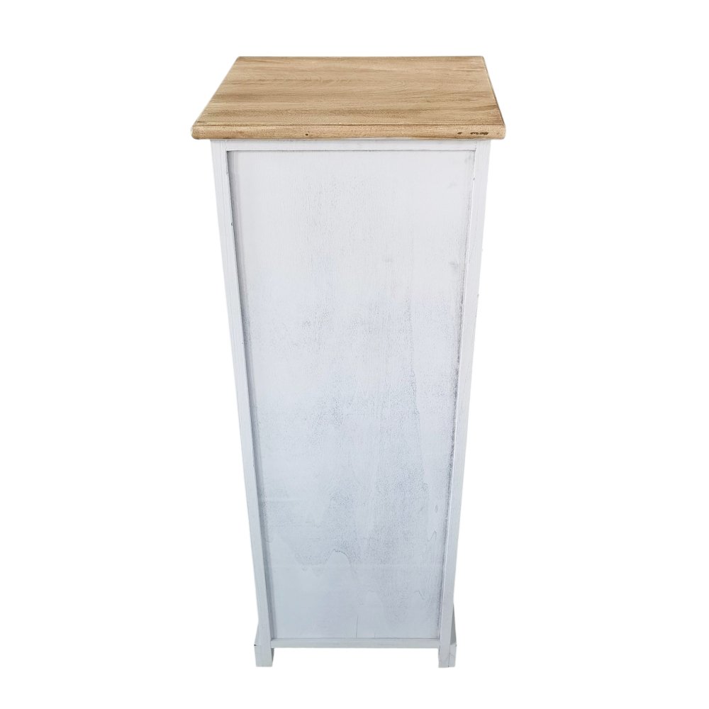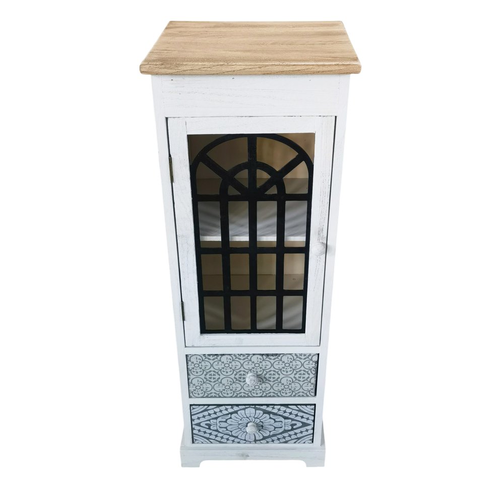 La cassettiera mobiletto per bagno camera LYRA è una raffinata soluzione d’arredo in perfetto stile shabby chic, pensata per donare un tocco di eleganza romantica e vissuta a qualsiasi ambiente. Realizzata in legno e MDF impiallacciato, si distingue per la finitura bianca decapata che valorizza le venature naturali del materiale, abbinata a un piano superiore color legno chiaro che aggiunge calore e contrasto. Le sue dimensioni compatte (32 x 29 x 88 cm) la rendono ideale per spazi ridotti, come bagni, camere da letto o ambienti di hotel, offrendo allo stesso tempo funzionalità e stile. Il design è impreziosito da una anta con vetro decorativo a griglia nera e due cassetti frontali con motivi ornamentali intagliati che evocano un’eleganza d’altri tempi. La cassettiera LYRA non è solo un mobile contenitore, ma un vero e proprio elemento decorativo capace di creare atmosfere accoglienti e raffinate. Perfetta per valorizzare sia ambienti privati che spazi ricettivi, esprime al meglio il suo potenziale in contesti dove il gusto per il dettaglio incontra la praticità quotidiana.