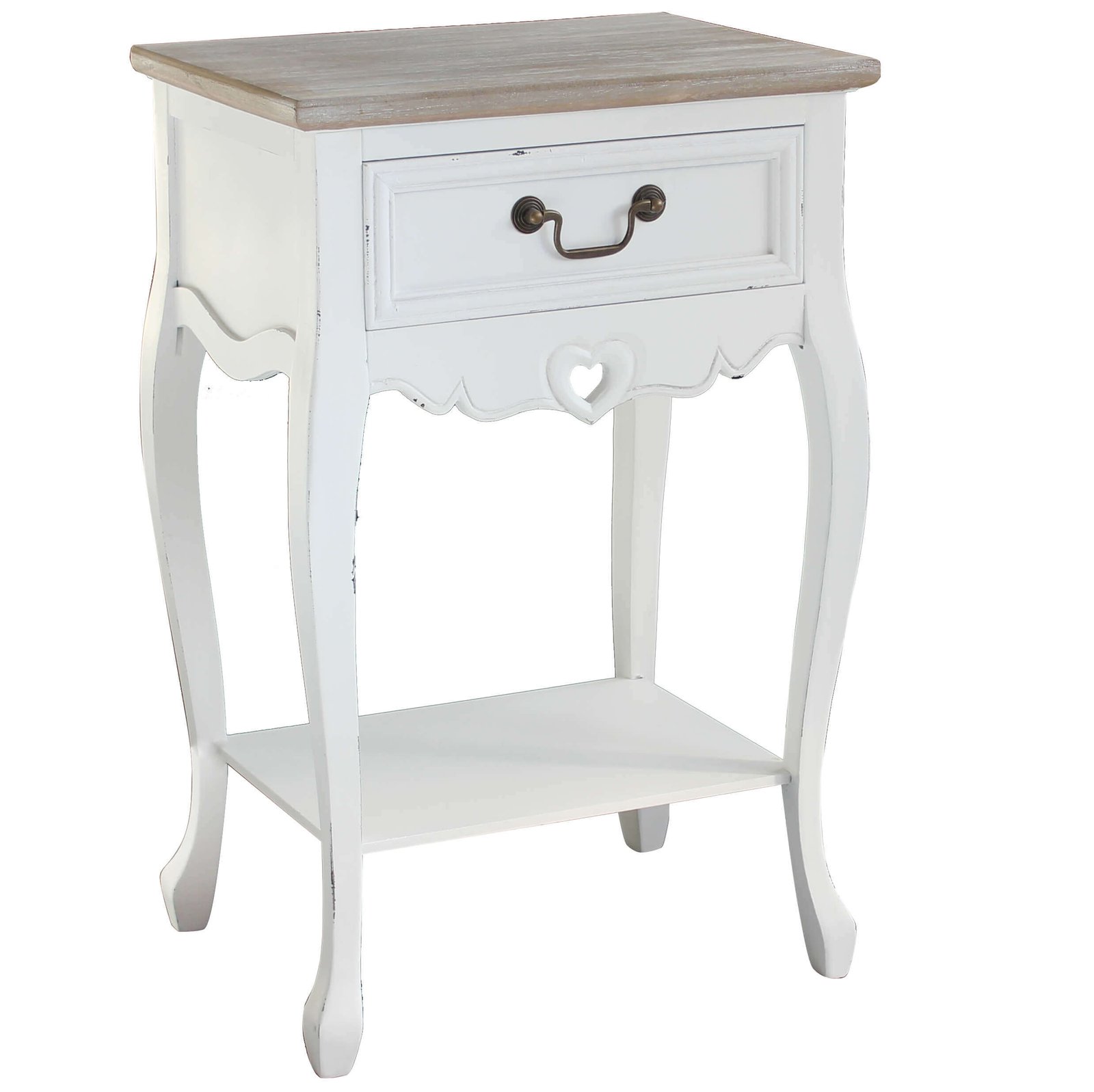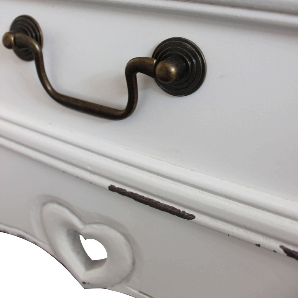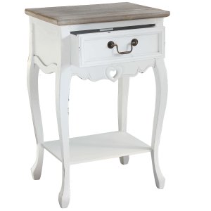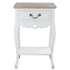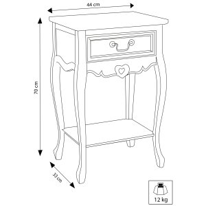 Raffinato e romantico, il *Mobiletto 1 cassetto shabby chic in Legno cm 44x33x70 – DETTA* è la scelta perfetta per chi desidera arredare con eleganza angoli della casa come la camera da letto, l’ingresso o la zona living. Realizzato in legno di paulonia e MDF impiallacciato, questo mobile unisce la solidità dei materiali a un’estetica delicatamente vintage. La struttura è rifinita in bianco, mentre il top color nocciola dona un piacevole contrasto naturale, enfatizzando lo stile shabby chic. Le linee sinuose delle gambe, il piccolo cassetto con maniglia in metallo anticato e il dettaglio traforato a forma di cuore sono elementi distintivi che esprimono cura artigianale e gusto per il dettaglio. Le dimensioni contenute, di 44x33x70 cm, lo rendono versatile e funzionale anche in spazi ridotti, offrendo praticità grazie al cassetto portaoggetti e al ripiano inferiore. Il mobiletto DETTA conferisce un tocco caldo e accogliente a ogni ambiente, evocando atmosfere rustiche e romantiche tipiche dell’arredo country provenzale. Ideale per chi ama uno stile femminile, delicato e senza tempo, valorizza al meglio ambienti intimi e luminosi.