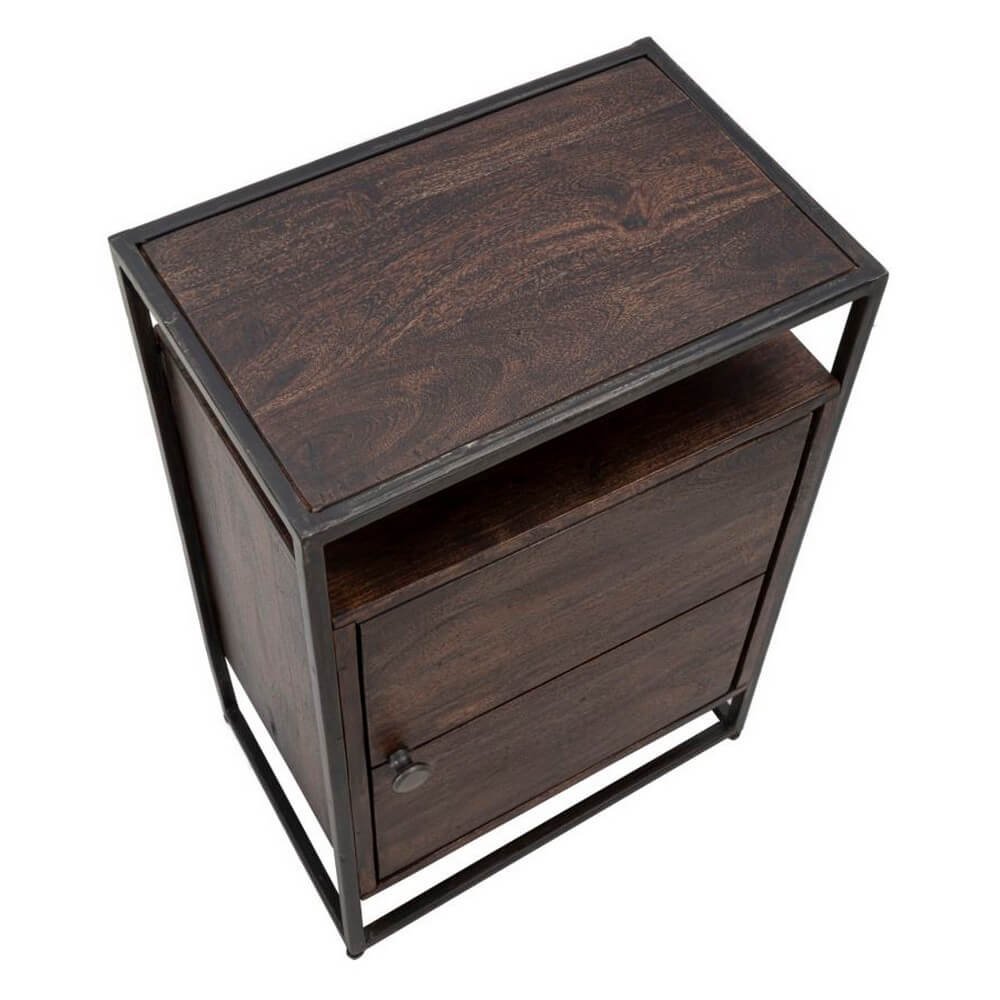 Comodino in legno massello di acacia con ripiano e anta incorniciato in una struttura in metallo nero dalle linee pulite e squadrate che dona un tocco di modernità ad un pezzo estrememante elegante e classico.