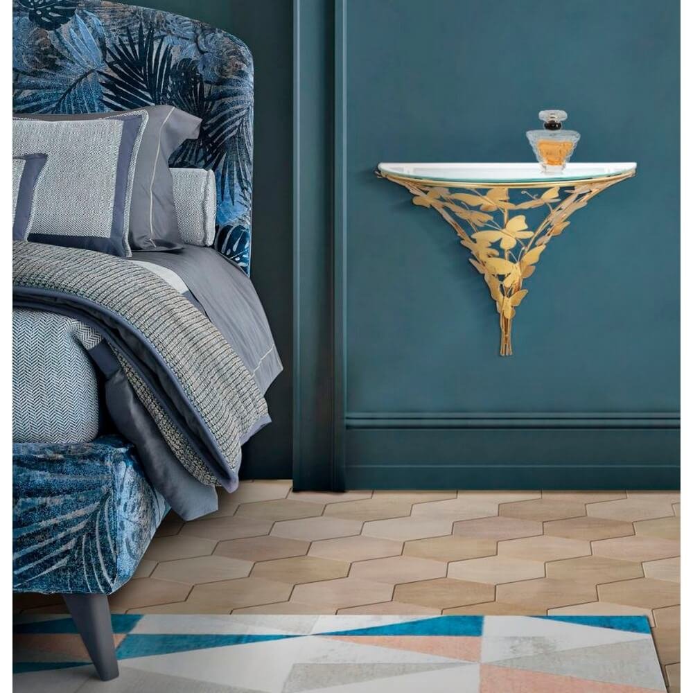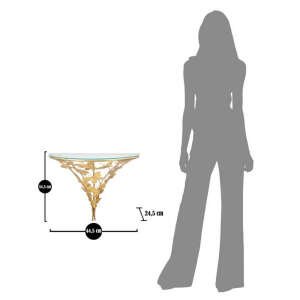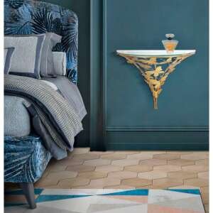 Comodino semicircolare da parete in metallo dorato con piano in vetro. La base รจ riccamente decorata da farfalle in volo. Il particolare design dona un tocco di classe e relax ad ogni ambiente.