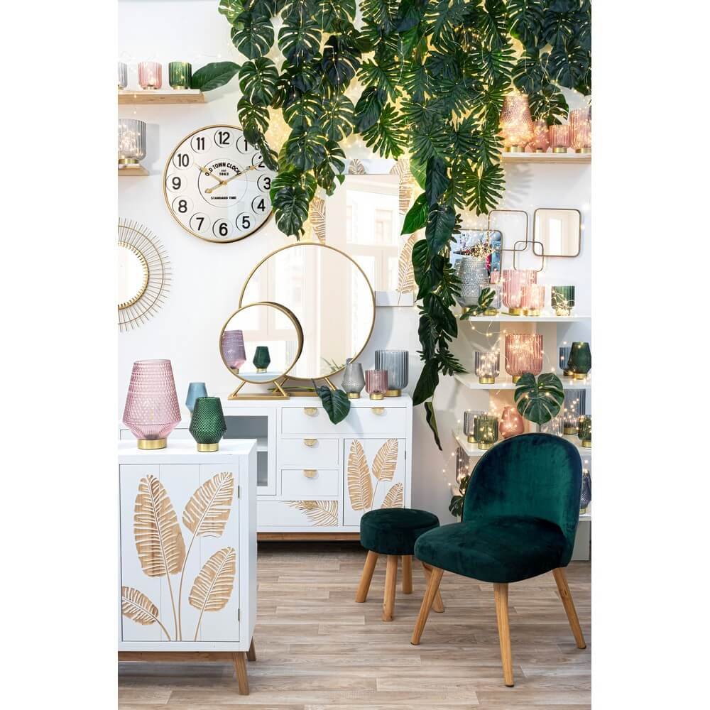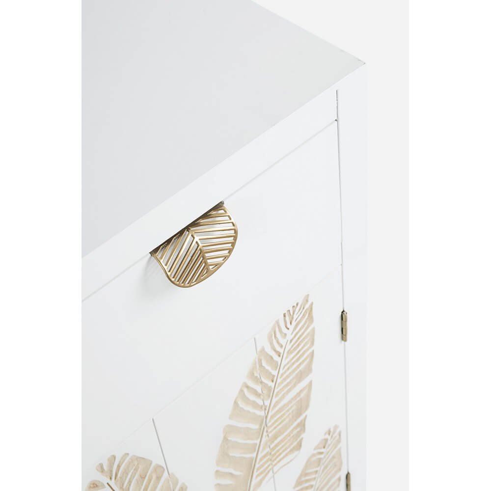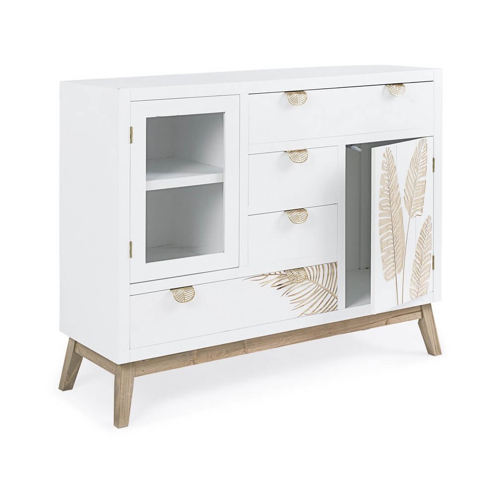 La Credenza Legno Bianco Boho da Interno – FLORA è la scelta ideale per chi desidera aggiungere un tocco di eleganza naturale e contemporanea all’arredo della propria casa. Realizzata con una struttura solida in abete e MDF, completa di piano e schienale in MDF, questa credenza è impreziosita da frontali in paulonia decorati con raffinati intarsi a mano che richiamano motivi botanici, donando un fascino artigianale e ricercato allo stile boho. Il colore bianco opaco, ottenuto con vernice a base d’acqua, contribuisce a creare un’atmosfera luminosa e rilassante, perfetta per ambienti living, sale da pranzo o ingressi dal gusto moderno e naturale. Le maniglie in acciaio dorato dalla forma a foglia aggiungono un dettaglio distintivo e prezioso, mentre le gambe svasate in finitura legno naturale conferiscono slancio e stabilità all’intera struttura. Con vani, cassetti e sportelli – alcuni con inserti in vetro – offre un’ottima capacità contenitiva senza rinunciare allo stile. La credenza FLORA trova la sua massima espressione in ambienti dallo spirito bohemien, etnico o scandinavo, dove diventa protagonista grazie al perfetto equilibrio tra funzionalità, design ed emozione visiva.