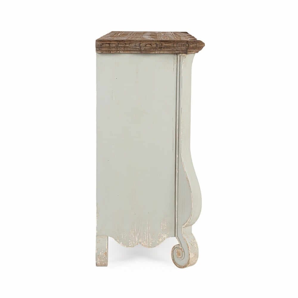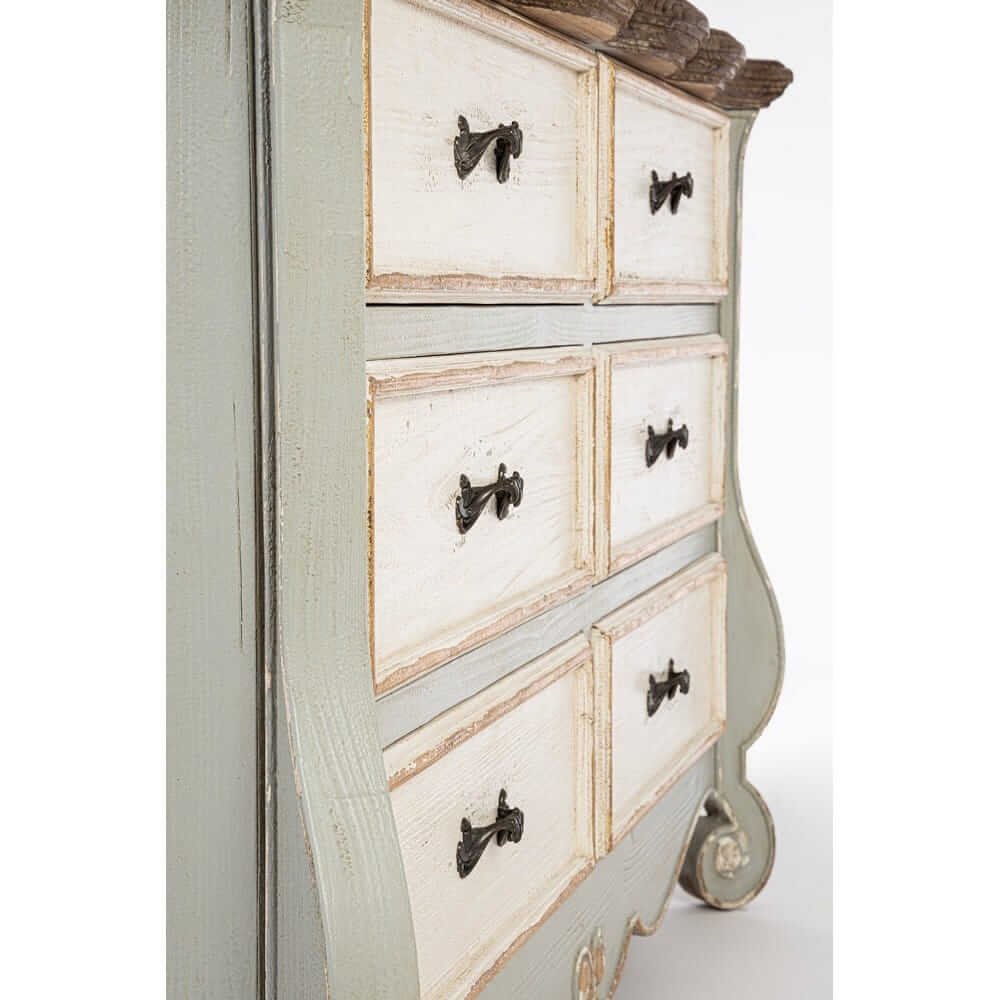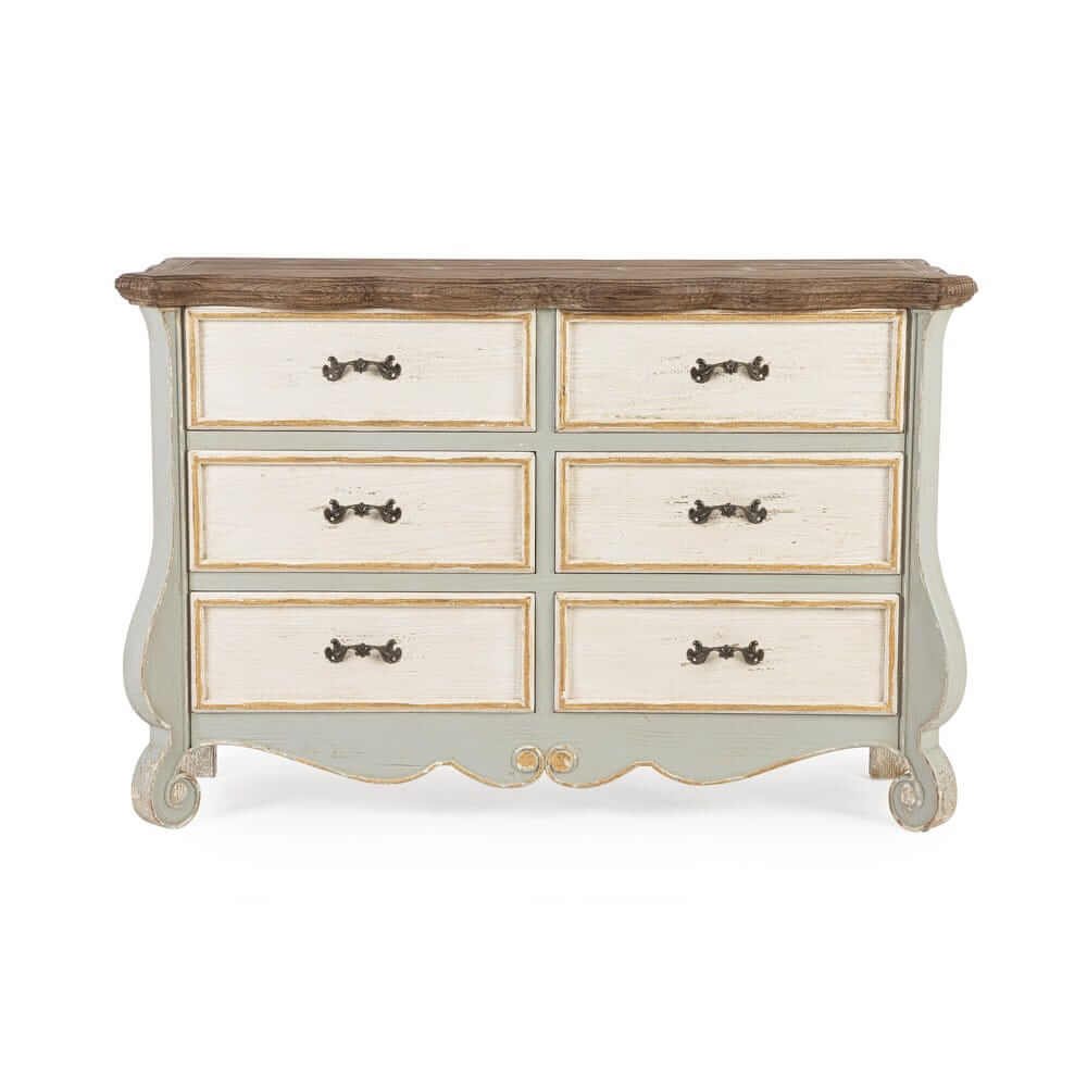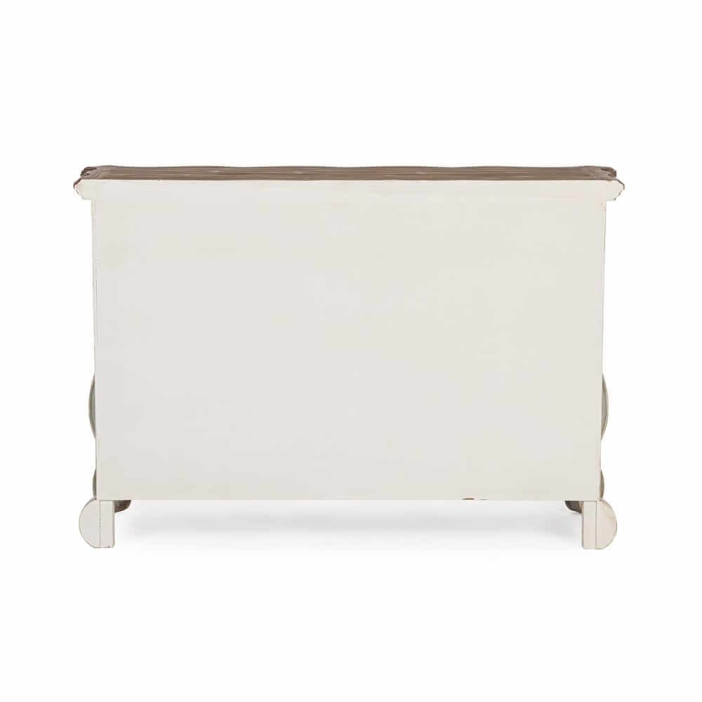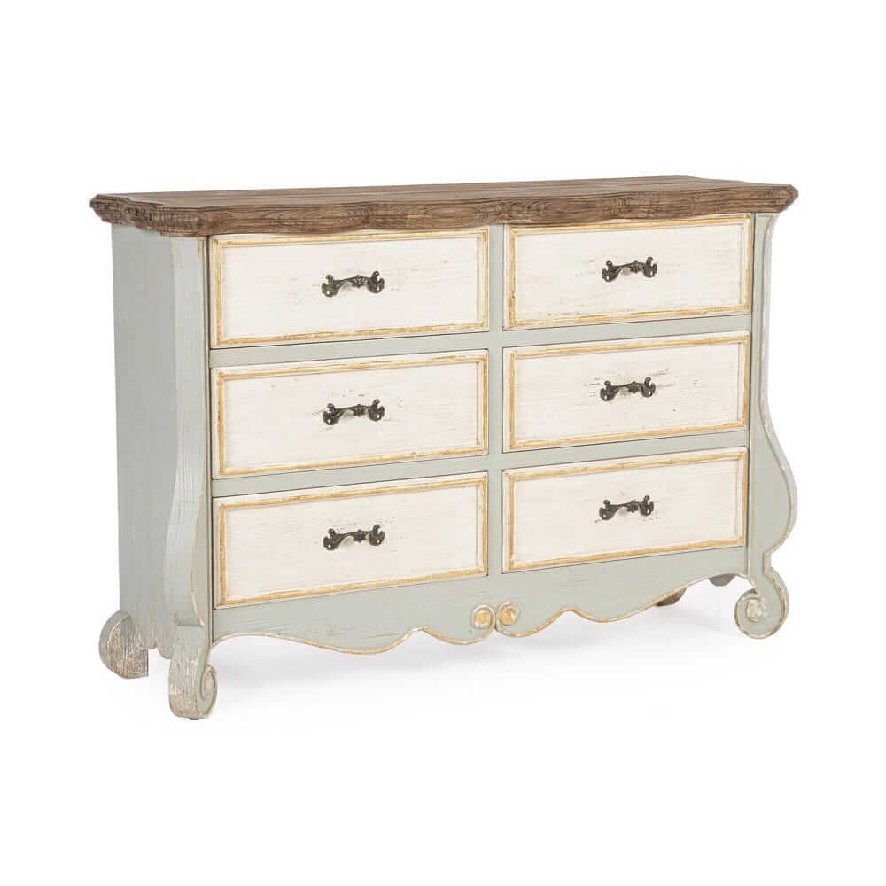 La Credenza Legno Bianco e Naturale Rustica da Interno – MODERN RUSTIC è un arredo dal fascino intramontabile che unisce con eleganza il calore del legno naturale allo stile shabby chic. Realizzata per il 95% in legno di abete, materiale noto per la sua robustezza e resa estetica, presenta una struttura solida e dettagli curati, come i cassetti e il retro in MDF che garantiscono leggerezza e funzionalità. Il design presenta sei ampi cassetti con frontali finemente anticati in bianco opaco e contorni leggermente dorati, valorizzati da maniglie in ferro dal gusto vintage. Il piano superiore, in legno naturale scuro con finitura spazzolata, crea un bel contrasto materico visivo e aggiunge una nota calda e accogliente all’intera composizione. Le linee del basamento e dei fianchi, delicatamente sagomate, conferiscono un’eleganza classica che si inserisce perfettamente in ambienti arredati in stile rustico, provenzale o country chic. Ideale per il soggiorno, l’ingresso o la zona living, la credenza MODERN RUSTIC non è solo un complemento di arredo estetico, ma anche una soluzione pratica per organizzare con stile. La sua presenza racconta di ambienti vissuti, dove il design scalda l’atmosfera e rende l’esperienza domestica più autentica.