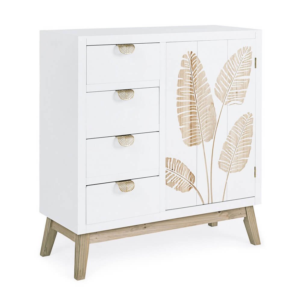 Elegante e raffinata, la Credenza Legno Bianco Moderna da Interno – FLORA è un perfetto esempio di arredo casa che unisce design contemporaneo e richiami naturali. Realizzata con una struttura in abete e MDF, presenta un piano e uno schienale in MDF, mentre il frontale di ante e cassetti è impreziosito da inserti in paulonia intarsiata a mano, che raffigurano foglie stilizzate dal delicato effetto naturale. Il design moderno viene esaltato dalla finitura bianca con vernice a base d’acqua, che regala luminosità e freschezza all’ambiente, rendendola ideale per soggiorni, ingressi o camere da letto dal gusto moderno, boho o nordico. Le maniglie in acciaio con forma di foglia lucida, unite alle gambe in legno grezzo da assemblare, aggiungono un tocco decorativo e materico che esalta l’originalità del mobile. La credenza FLORA non è solo un elemento d’arredo decorativo, ma anche una soluzione pratica e capiente grazie ai suoi cassetti e ante, perfetta per organizzare con stile. Pensata per chi ama gli interni dal design pulito ma caratterizzati da dettagli artistici, la sua estetica evocativa trasmette un senso di leggerezza e armonia, trasformando ogni spazio in un angolo accogliente e distintivo.