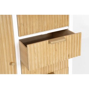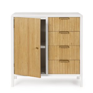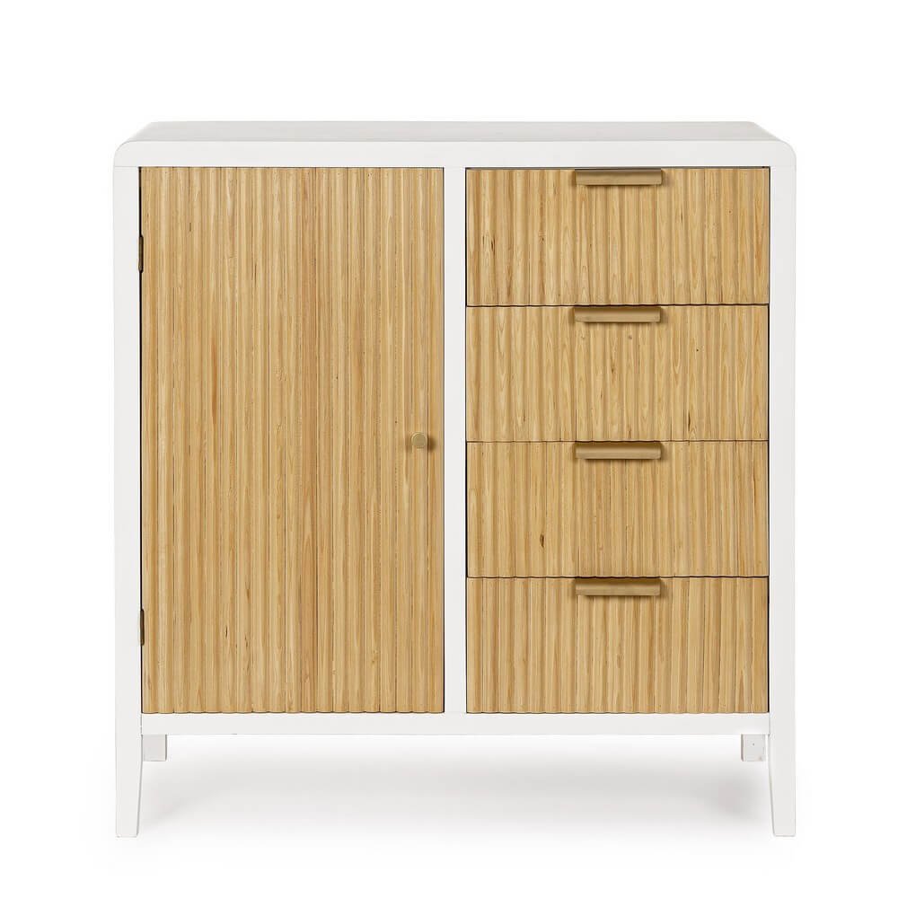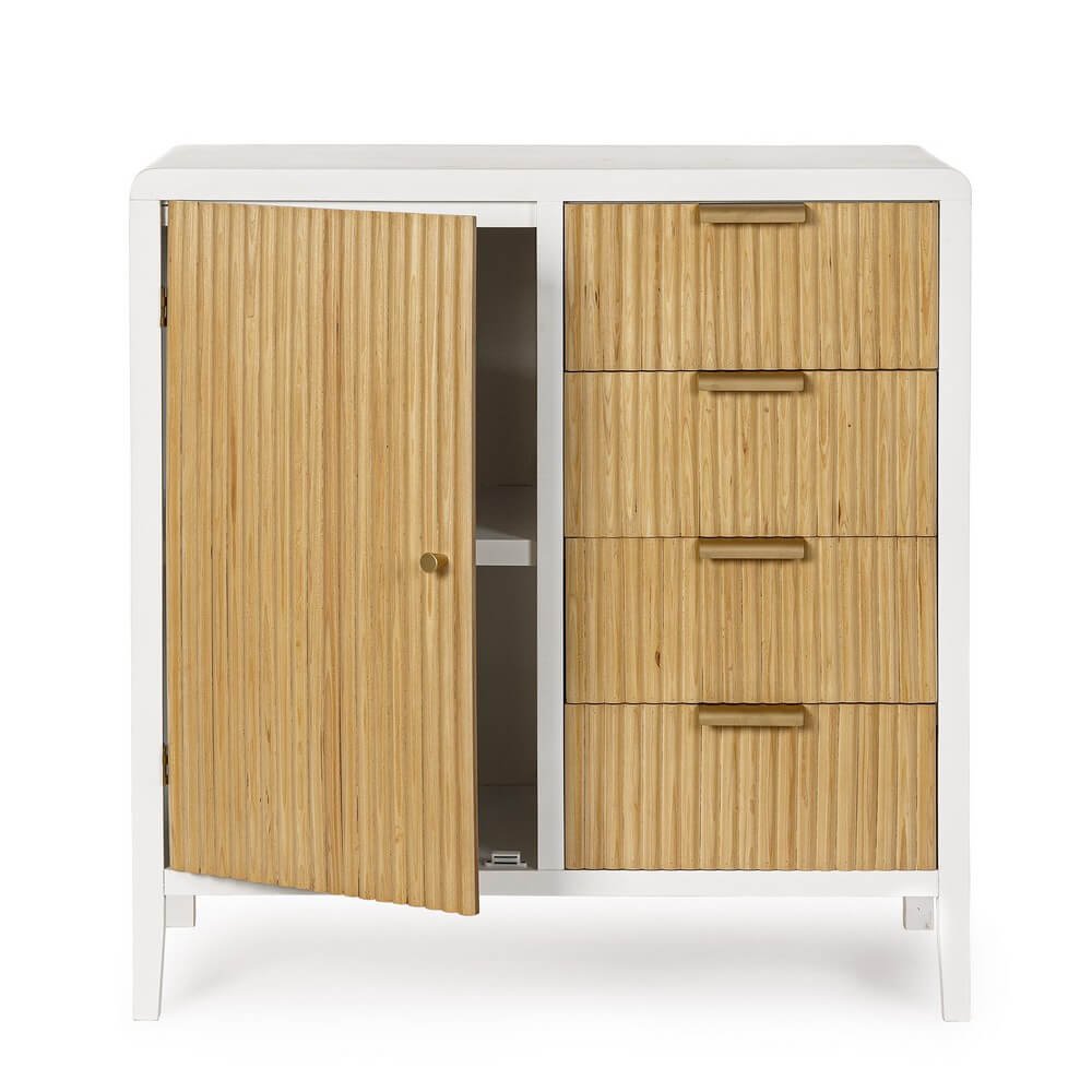 La Credenza Legno Bianco Moderno da Interno – CHARLOTTE è un complemento d’arredo raffinato e funzionale, pensato per arricchire con gusto ambienti interni moderni o in stile nordico. Realizzata con una struttura solida in MDF, presenta cassetti in paulownia con fondo impiallacciato, gambe in legno di pino e maniglie in acciaio, per un perfetto equilibrio tra robustezza e leggerezza estetica. Il contrasto tra il bianco opaco della finitura a base d’acqua e il tono naturale del legno scanalato di ante e cassetti dona movimento visivo e calore materico, rendendo la credenza CHARLOTTE un elemento distintivo nel soggiorno, nell’ingresso o persino nello studio. La superficie liscia e le linee essenziali ne esaltano l’anima contemporanea, mentre i quattro cassetti e l’ampio vano ad anta ne valorizzano la praticità quotidiana. Ideale per chi cerca mobili moderni in legno capaci di unire design, funzionalità e stile naturale, questa credenza regala un’atmosfera accogliente e ordinata, diventando un punto focale che valorizza qualsiasi spazio abitativo.