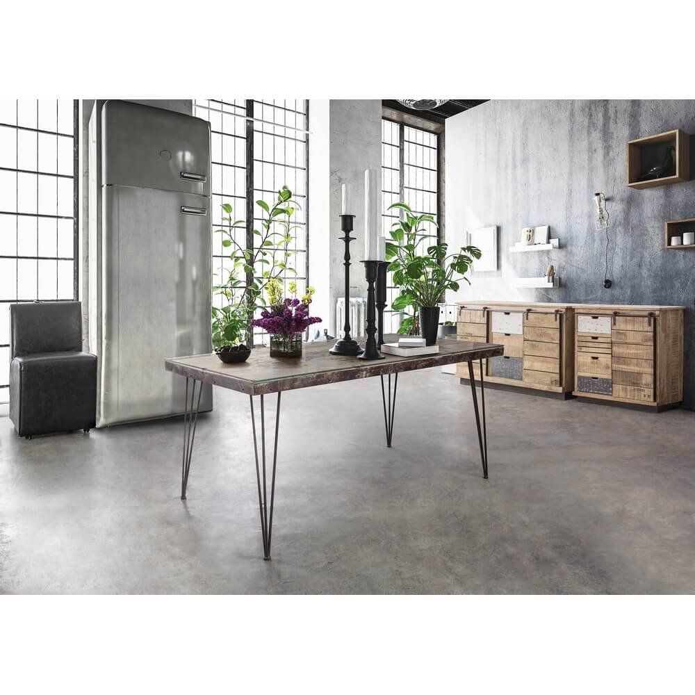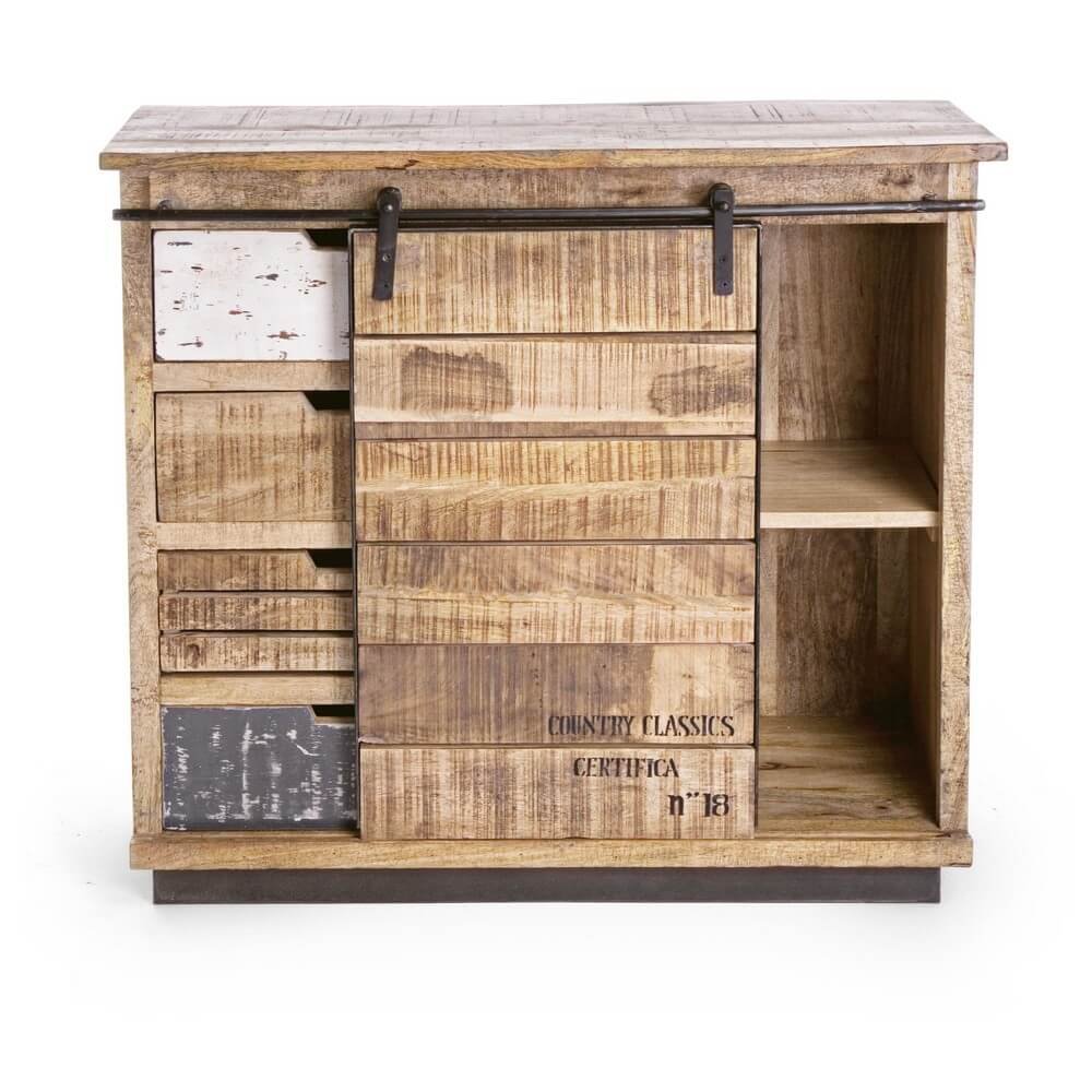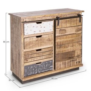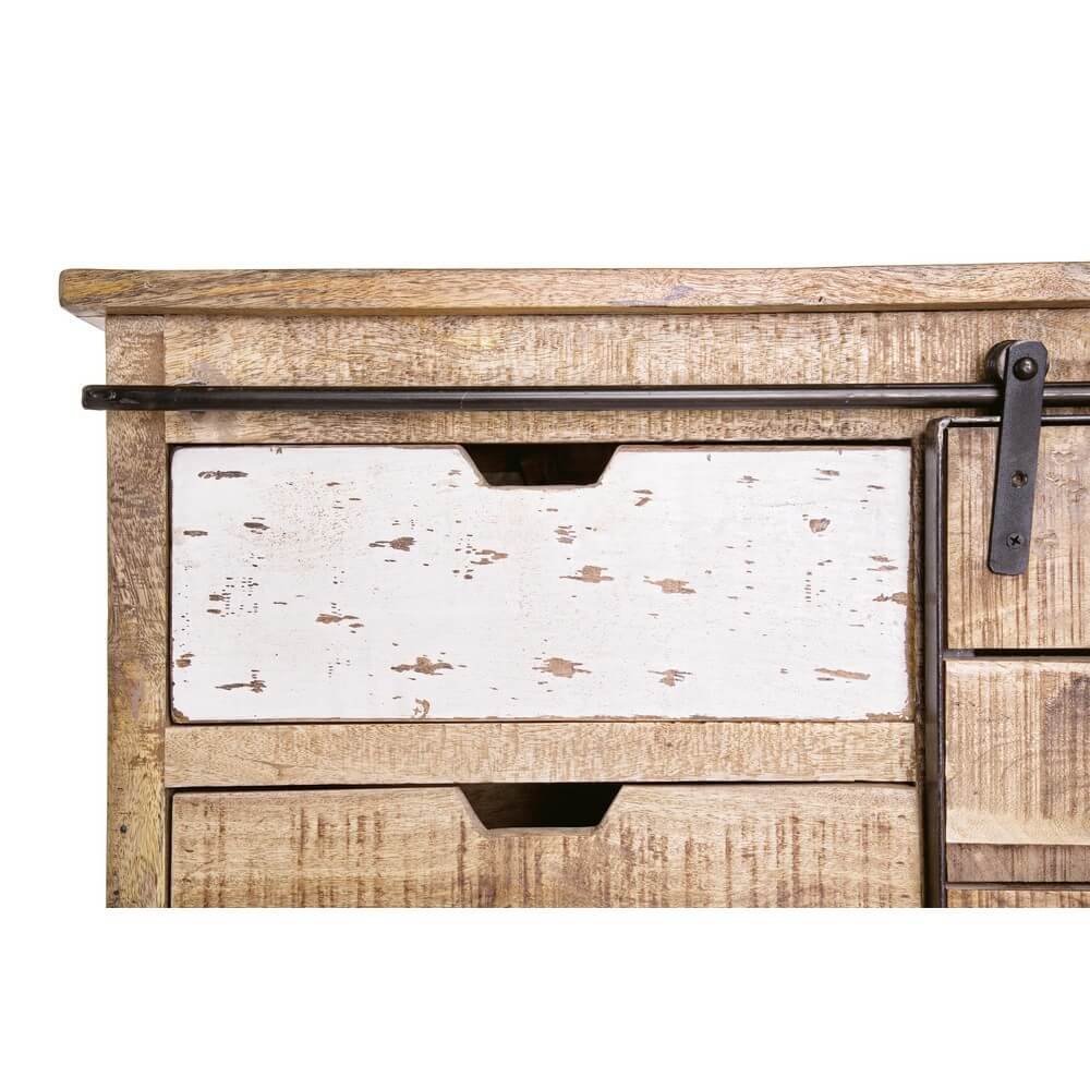 La Credenza Legno Marrone Rustico da Interno – THEODORE è un pezzo d’arredo unico e di grande carattere, ideale per ambienti che abbracciano lo stile rustico, industriale o vintage. Realizzata in legno di mango, con una struttura solida e naturale, è completata da una robusta base in acciaio che ne enfatizza il contrasto materico ed estetico. La finitura a base di nitrocellulosa dona al mobile un aspetto vissuto e autentico, esaltando le venature del legno e le imperfezioni volute per un effetto artigianale. Visivamente sorprendente, presenta una combinazione asimmetrica di cassetti in varie dimensioni e finiture, con frontali dipinti in bianco e grigio effetto decapato e una pratica anta a scorrimento su binario metallico, che aggiunge un tocco industrial. Questo mobile da interno si distingue per la sua forte personalità, la funzionalità e la capacità di valorizzare spazi giorno, ingressi o zone living con elementi d’arredo caldi ma dal gusto deciso. Con la THEODORE, ogni ambiente acquisisce un senso di autenticità e calore, ideale per chi cerca un complemento d’arredo pratico ma capace di raccontare una storia.