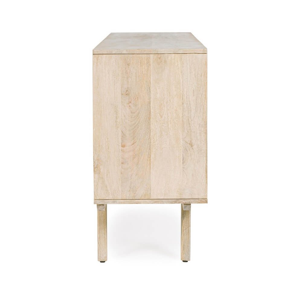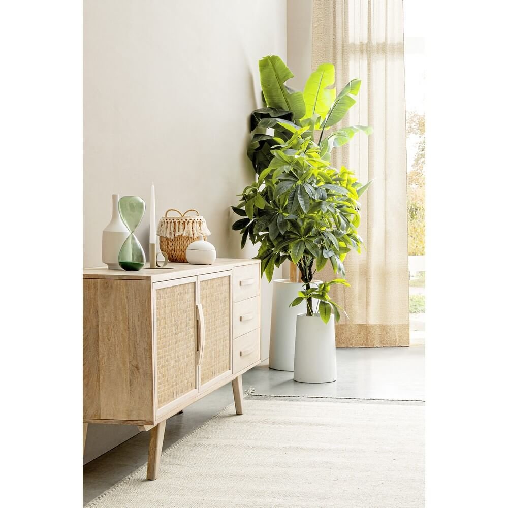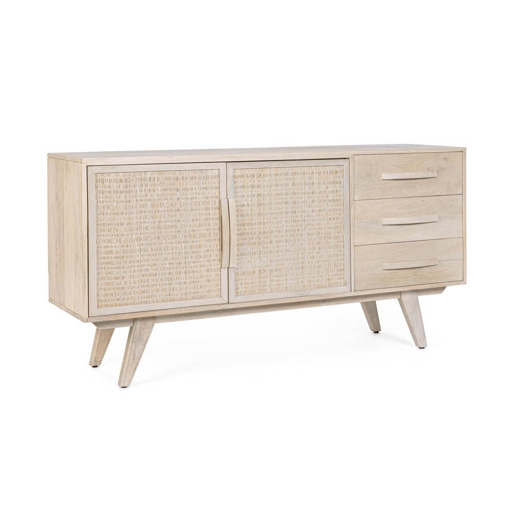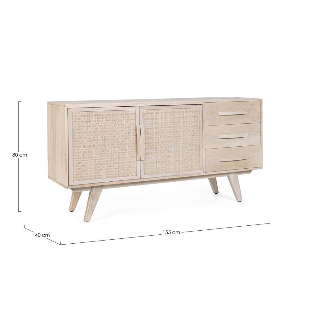 La Credenza Legno Marrone Stile Boho da Interno – LENA è un raffinato elemento d’arredo che coniuga estetica naturale e funzionalità pratica, pensato per valorizzare ambienti interni con un tocco di eleganza boho chic. Realizzata in legno di mango, con schienale e fondo cassetti in MDF, questa credenza si distingue per i frontali delle ante in rattan intrecciato, che donano leggerezza visiva e un richiamo autentico ai materiali naturali. La verniciatura a base di nitrocellulosa con decapatura bianca crea un effetto vissuto e luminoso, perfetto per interni dal gusto etnico, scandinavo o contemporaneo. Tre comodi cassetti e due ante con vano interno e mensola offrono spazio organizzato per oggetti di uso quotidiano o per custodire preziosi dettagli d’arredo. I piedini obliqui, da assemblare, aggiungono un tocco rétro e garantiscono stabilità, slanciando la struttura. La credenza LENA trova la sua massima espressione in soggiorni, ingressi o zone living dove si voglia inserire un mobile caldo, accogliente e distintivo, capace di trasmettere un’atmosfera rilassata e ricercata.