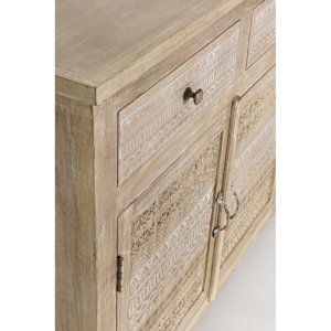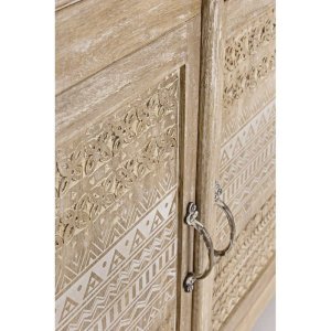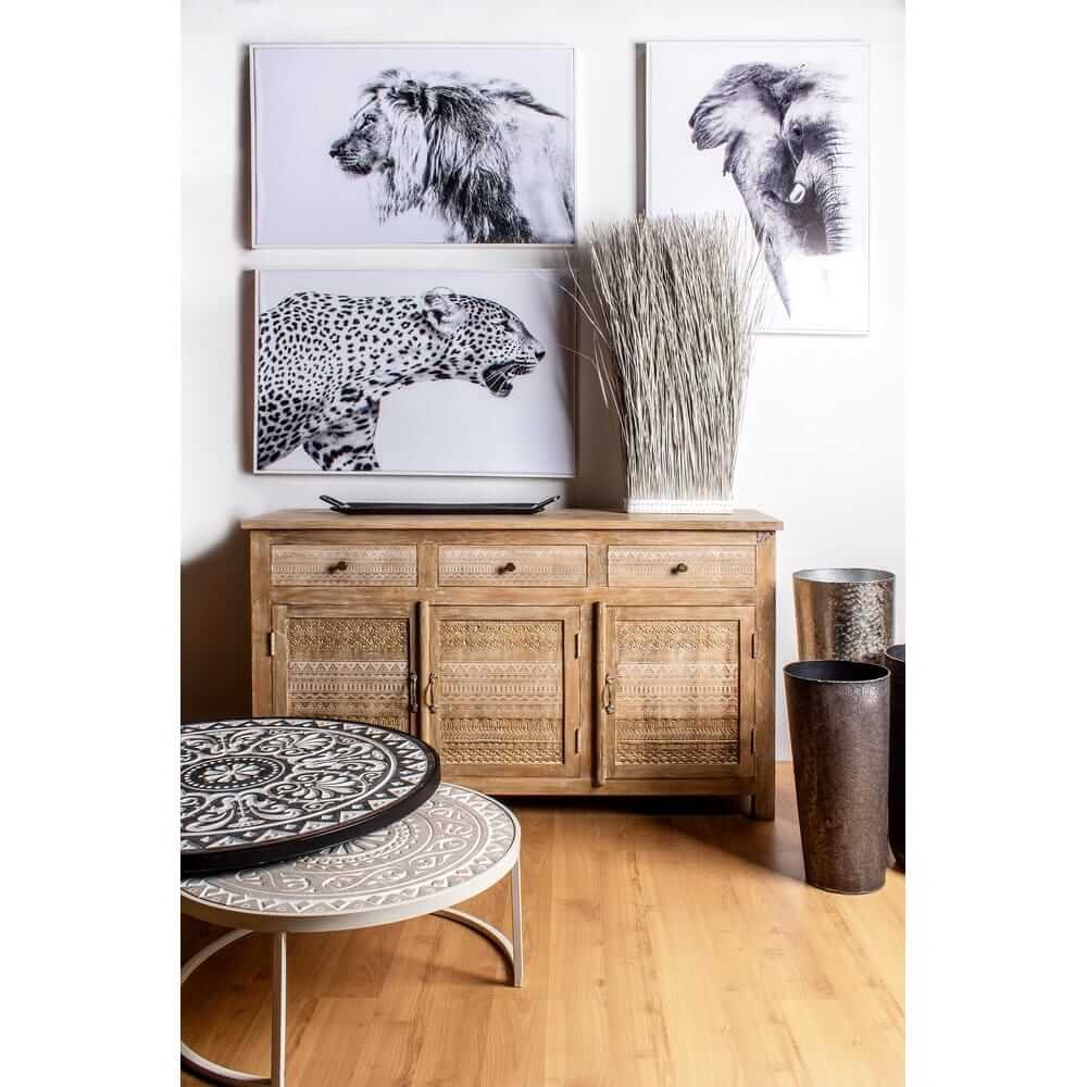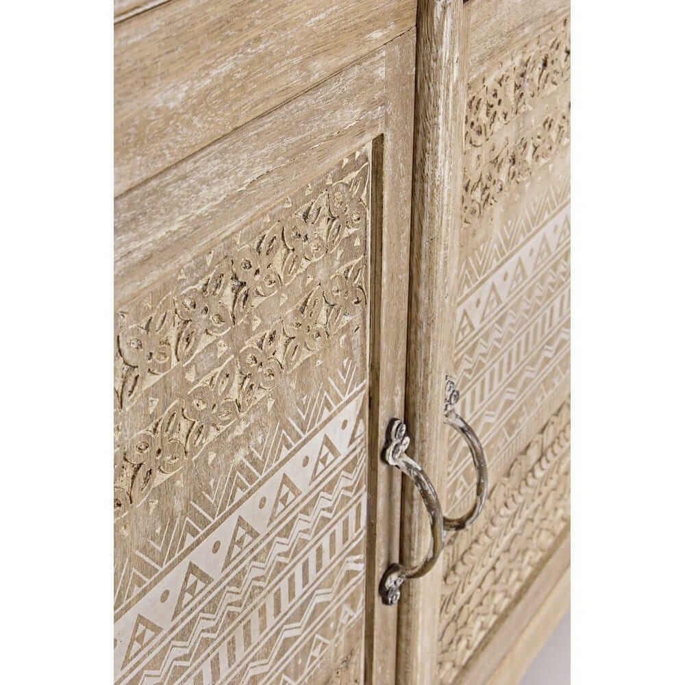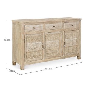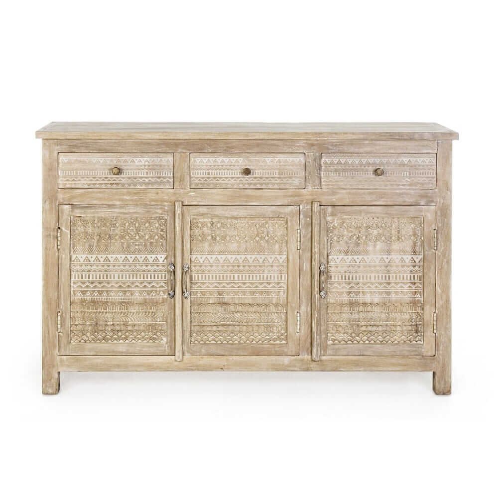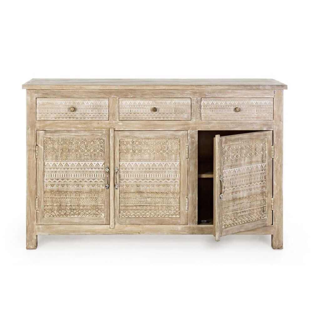 La Credenza Legno Naturale Rustica da Interno – LENA è un complemento d’arredo che unisce con eleganza praticità e stile artigianale, pensato per chi desidera portare calore e autenticità negli ambienti domestici. Realizzata in legno di mango massello, presenta una finitura dall’effetto naturale che valorizza le venature del legno, impreziosita da raffinate decorazioni intarsiate a mano che donano carattere unico a ogni singolo elemento. Le ante e i cassetti sono arricchiti da motivi geometrici scolpiti, perfettamente in linea con uno stile etnico-rustico, ideale per ambienti dallo spirito bohémien, country o shabby chic. La struttura è robusta e ben rifinita, con dettagli in ottone come pomelli e maniglie, mentre lo schienale e il fondo dei cassetti in MDF garantiscono leggerezza e stabilità. La credenza LENA offre ampio spazio contenitivo grazie ai tre capienti cassetti e ai vani con mensola interna, perfetti per organizzare stoviglie, tessili o oggetti decorativi. Questo mobile si inserisce con naturalezza in soggiorni, open space o ingressi, esprimendo al meglio il suo valore in contesti dove il fascino dell’artigianato incontra il comfort dell’arredo quotidiano.