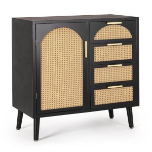 La Credenza Legno Nero Boho da Interno – JOSIE è l’arredo perfetto per chi desidera unire funzionalità e stile ricercato in un unico pezzo distintivo. Con una struttura solida in legno di pino e un’elegante finitura nera opaca, questa credenza si distingue per il suo design boho chic, impreziosito da inserti in rattan naturale su ante e cassetti che donano calore e texture all’ambiente. I dettagli curati, come le maniglie in acciaio dorato e le gambe affusolate da assemblare, aggiungono un tocco moderno e sofisticato. Il contrasto tra il nero profondo e il rattan chiaro crea un effetto visivo armonioso che valorizza qualsiasi soggiorno, ingresso o zona pranzo, rendendo la credenza JOSIE un complemento d’arredo capace di trasformare l’atmosfera con personalità. Perfetta per contenere oggetti quotidiani o decorativi, questa credenza in legno con dettagli in MDF offre spazio e carattere, fondendo linee contemporanee con richiami esotici. Ideale per ambienti dallo stile boho, etnico o moderno, esprime al meglio il suo valore in interni accoglienti dove si vuole esaltare originalità e gusto estetico.