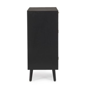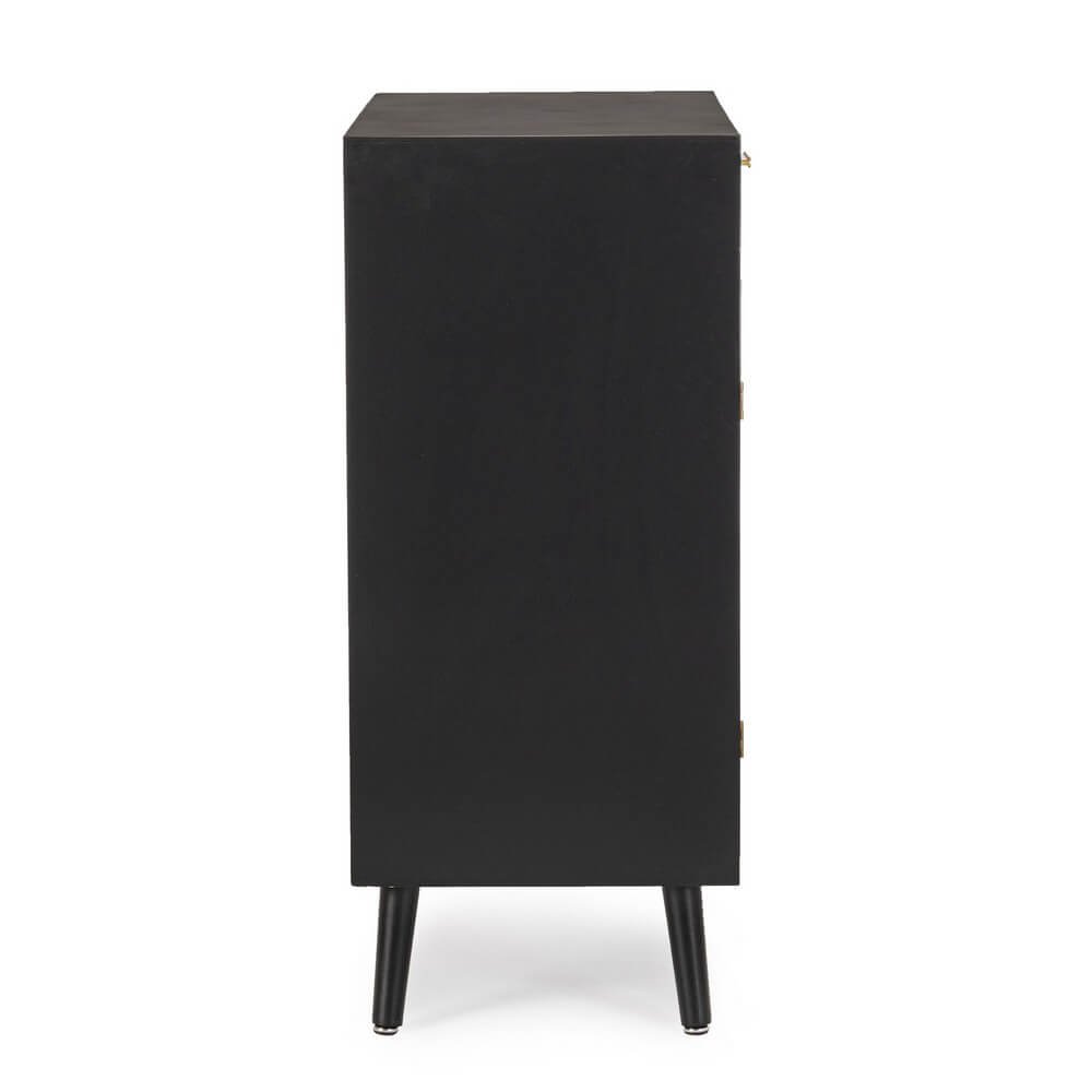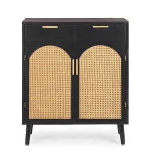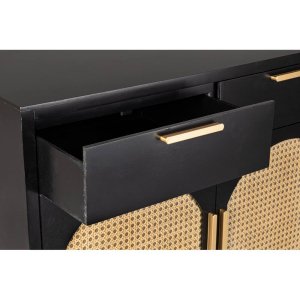 La credenza in legno nero boho da interno JOSIE è l’emblema perfetto di un design sofisticato che fonde tradizione artigianale ed estetica contemporanea. Realizzata con una struttura in legno di pino e dettagli in MDF, presenta ante e cassetti arricchiti da eleganti inserti in rattan naturale incorniciati da archi che conferiscono al mobile un fascino esotico e materico. Le gambe affusolate in legno di pino, facilmente assemblabili, sollevano visivamente la struttura donando leggerezza al design, mentre le raffinate maniglie in acciaio dorato aggiungono un tocco di modernità e pregio. Il contrasto tra il nero profondo della superficie e le texture calde del rattan crea un equilibrio perfetto in stile boho-chic, ideale per ambienti interni ricercati come soggiorno, ingresso o sala da pranzo. La Credenza Legno Nero Boho da Interno – JOSIE non è solo un elemento d’arredo funzionale, ma anche un pezzo distintivo capace di arricchire qualsiasi spazio con personalità e charme. Perfetta per chi desidera un mobile che unisca praticità, gusto e originalità, si esprime al meglio in contesti rilassati ma curati, dove ogni dettaglio racconta uno stile unico.
