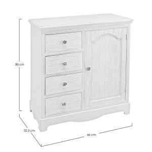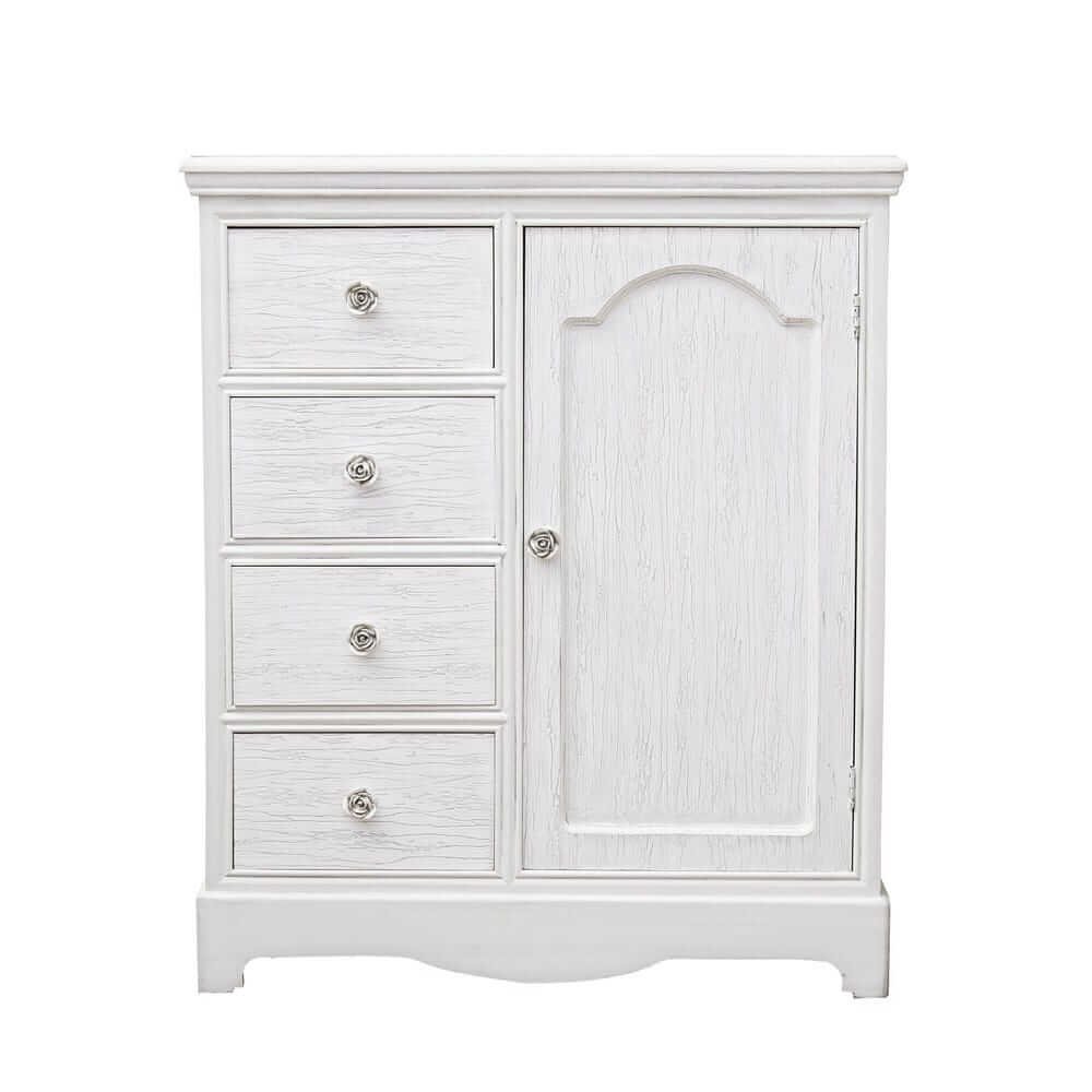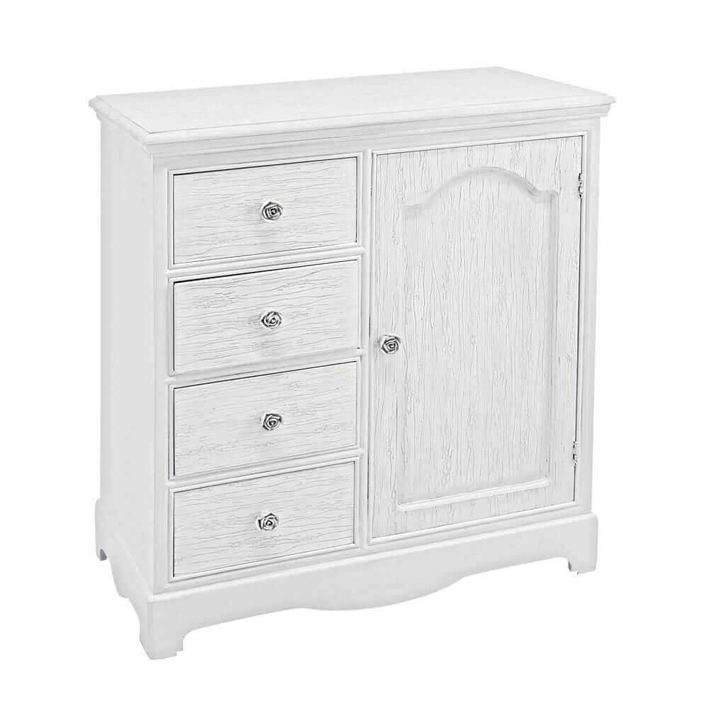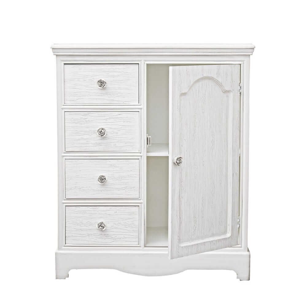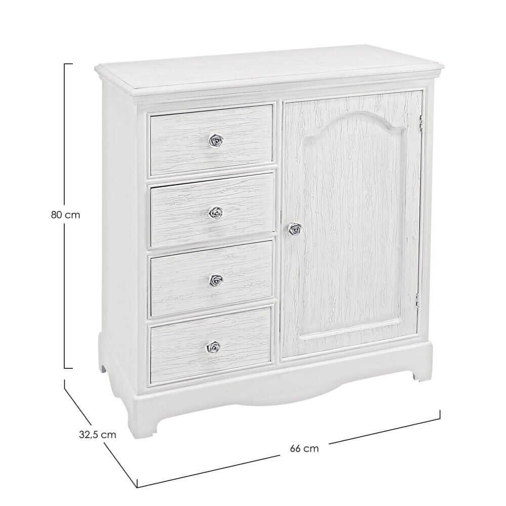 La credenza MDF Impiallacciato Bianca Rustica da Interno – IVORY è la scelta ideale per chi desidera arredare la propria casa con un tocco raffinato e romantico. Realizzata in resistente MDF con impiallacciatura e finitura bianca opaca, questa credenza si distingue per i suoi frontali e piani effetto decapato, che evocano lo stile shabby chic con eleganza discreta. Le maniglie in poliresina, decorate con raffinati motivi floreali, aggiungono un dettaglio decorativo dallo charme senza tempo. Dotata di quattro pratici cassetti e un vano con anta completa di mensola interna, offre una capienza funzionale per riporre oggetti e mantenere l’ambiente ordinato. Il design dalle linee morbide e i dettagli curati conferiscono alla credenza IVORY una presenza accogliente e luminosa, perfetta per valorizzare ambienti come soggiorni, ingressi o camere da letto in stile country, provenzale o rustico raffinato. Questa credenza non è solo un complemento d’arredo, ma un elemento che trasmette calore e personalità allo spazio in cui viene inserita, ideale per chi ama circondarsi di bellezza e praticità nella vita quotidiana.