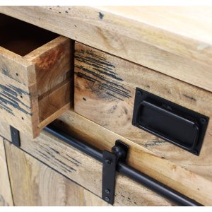 La **Credenza per soggiorno Industrial in Legno cm 80x40x190 – RICK** è un arredo elegante e funzionale, perfetto per chi cerca uno stile deciso e contemporaneo per la propria casa. Realizzata in robusto legno di mango, questa credenza unisce la calda matericità del legno naturale con dettagli in acciaio nero effetto grezzo, tipici del design industriale. Le venature e le imperfezioni del legno conferiscono unicità a ogni pezzo, rendendolo irripetibile e autentico. Dotata di un’anta scorrevole, due pratici cassetti e due ripiani interni, RICK offre un’ottima organizzazione degli spazi, ideale per contenere stoviglie, bottiglie o accessori da bar. Il sistema portabicchieri a vista nella parte superiore ne potenzia la versatilità, trasformandola in una raffinata zona bar domestica. Le linee verticali e la struttura slanciata (cm 90 x 40 x 190 h) la rendono perfetta anche per ambienti non troppo ampi, mantenendo alta la capacità contenitiva. La credenza RICK si inserisce con carattere in soggiorni, open space o cucine in stile industriale o rustico-moderno, regalando un’atmosfera accogliente e autentica, dove l’estetica si fonde con la funzionalità.