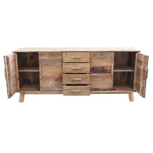 La Madia con 4 ante e 4 cassetti in Pino riciclato cm 200x48x85 – PINE è un arredo di grande fascino e carattere, pensato per chi desidera unire estetica naturale e funzionalità. Realizzata interamente in legno di pino riciclato, questa credenza si distingue per il suo stile rustico-industriale, con venature, nodi e imperfezioni che raccontano storie passate e conferiscono unicità a ogni pezzo. Il colore marrone caldo e vissuto amplifica la sensazione di autenticità, rendendola perfetta per ambienti dallo spirito country, shabby chic o anche per interni più moderni in cerca di un tocco materico e accogliente. Le quattro ante custodiscono vani spaziosi con ripiani adatti a organizzare stoviglie, tessili o oggetti vari, mentre i quattro cassetti centrali garantiscono ulteriore spazio contenitivo, tutto in linea con l’eleganza funzionale dell’arredo casa. Le linee pulite e solide, insieme alla struttura robusta e sostenibile, fanno della madia PINE una scelta ideale per la zona giorno, la sala da pranzo o un ingresso d’effetto. Un mobile che non passa inosservato, capace di donare calore e autenticità all’ambiente in cui viene collocato.