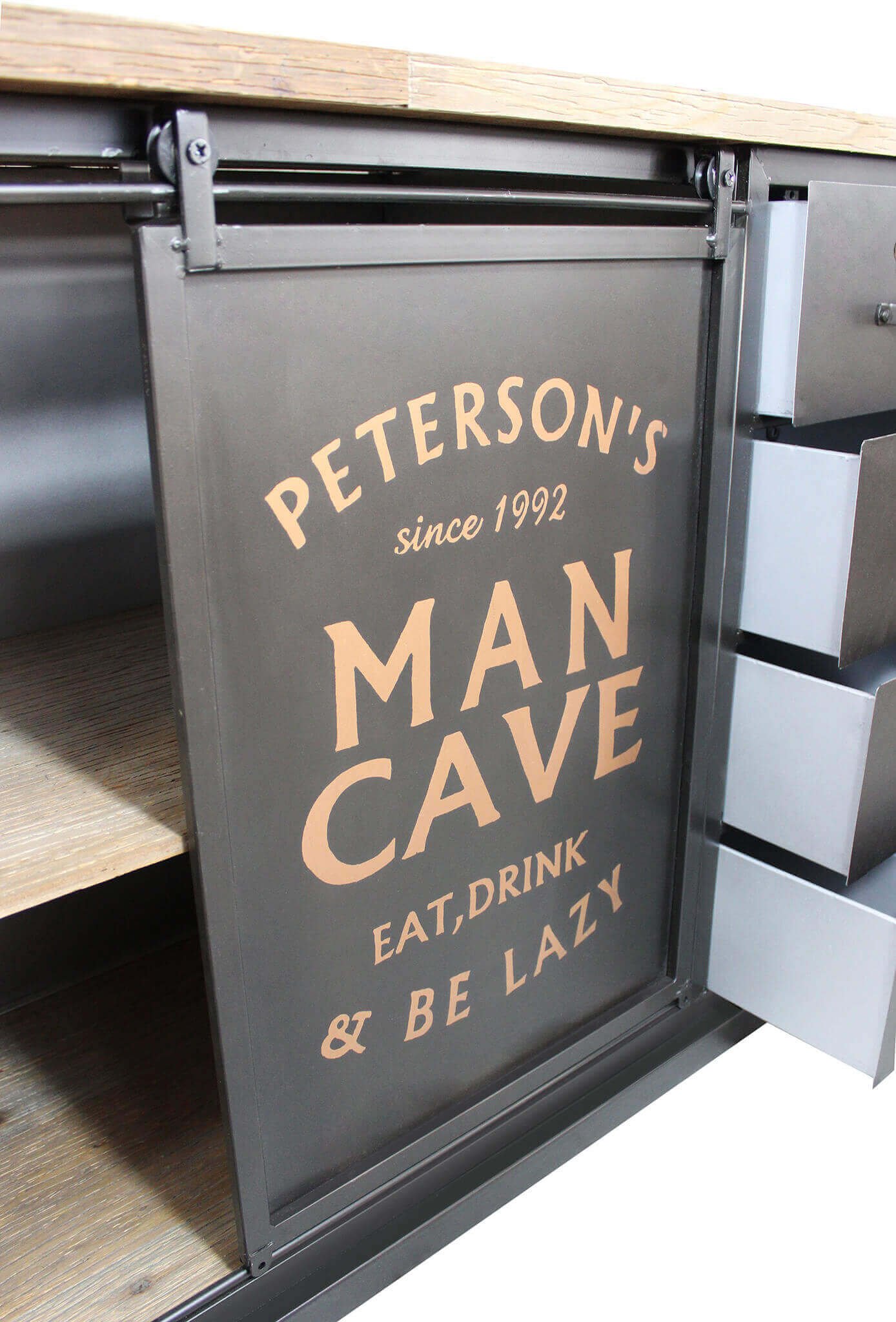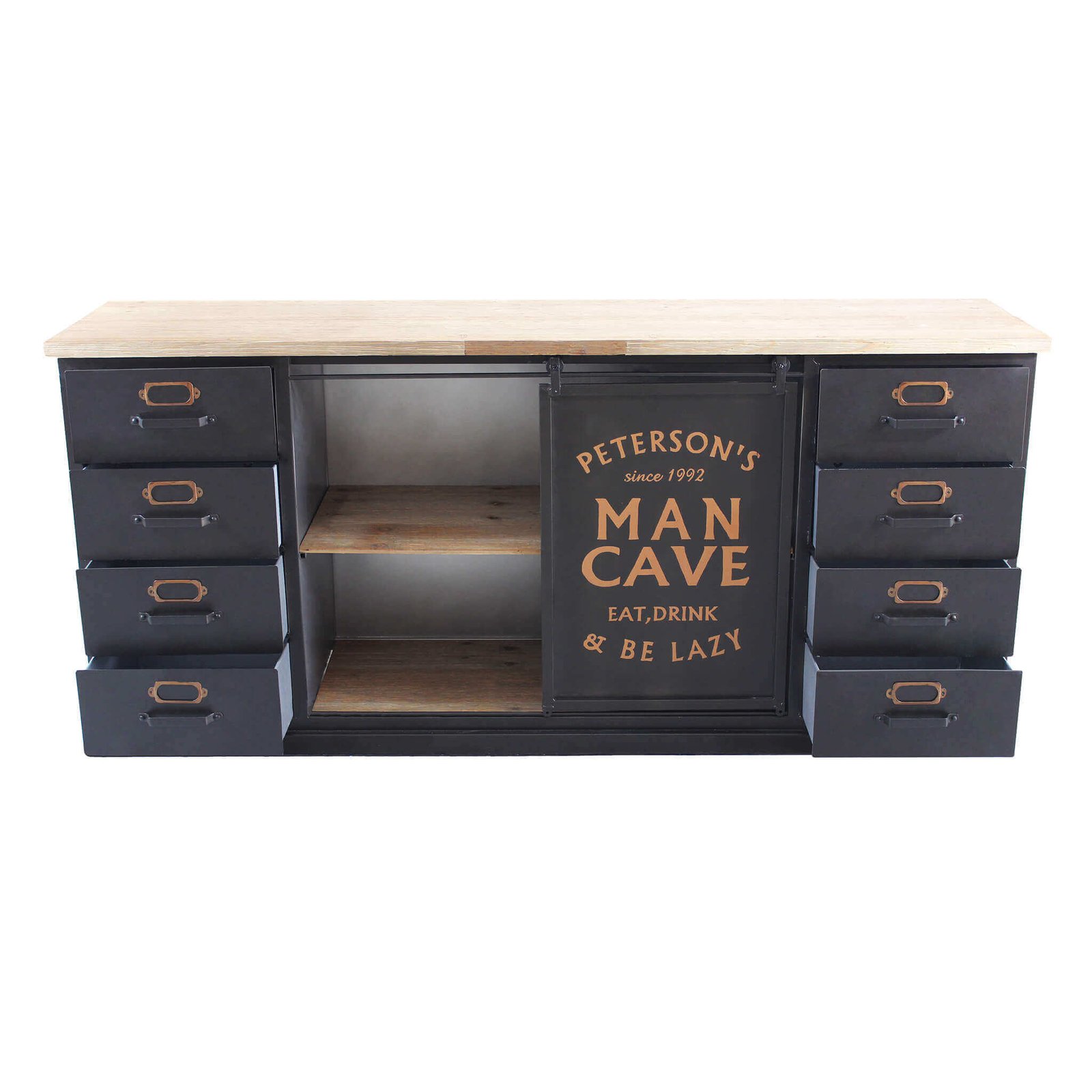 La Madia Industrial in Acciaio Legno cm 164,5x40x74,5 – QUINTON è un elemento d’arredo dal forte carattere, ideale per ambienti moderni che vogliono distinguersi con stile. Realizzata con materiali robusti come legno e acciaio, unisce la solidità strutturale alla raffinatezza estetica dello stile industrial. Il piano in legno a vista contrasta con la struttura in acciaio nero opaco, mentre i dettagli in metallo brunito e la scritta decorativa “Man Cave” sulla parte frontale aggiungono un tocco vintage distintivo. L’organizzazione interna, con sei cassetti capienti disposti simmetricamente ai lati e uno scomparto centrale con anta scorrevole, garantisce praticità e ampia capacità contenitiva. Questa credenza si inserisce perfettamente in soggiorni urban, loft contemporanei o spazi living dal sapore retrò, regalando personalità e funzionalità all’ambiente. La madia QUINTON non è solo un mobile contenitore, ma anche un elemento decorativo di forte impatto, perfetto per chi cerca un equilibrio tra estetica industriale e praticità quotidiana.