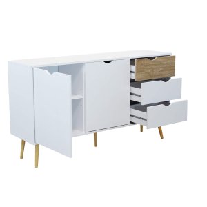 La Madia Moderna in Legno cm 147x39x82 – PALMER rappresenta la perfetta armonia tra estetica contemporanea e funzionalità per l’arredo casa. Con la sua struttura in truciolare bilaminato, combina il bianco luminoso delle superfici con l’elegante accento marrone naturale del primo cassetto, creando un gioco visivo di forte impatto ma raffinato. Le linee essenziali, i frontali lisci privi di maniglie e i piedini inclinati in stile nordico donano leggerezza e un tocco moderno a qualsiasi ambiente. Dotata di due ante laterali, tre ampi cassetti e una capiente anta centrale, PALMER offre uno spazio ben organizzato per contenere stoviglie, biancheria da tavola o oggetti decorativi, risultando ideale per la zona living, la sala da pranzo o un open space contemporaneo. La cura nei dettagli si riflette nelle sagomature ergonomiche per l’apertura, che sostituiscono le maniglie tradizionali con un design più pulito e funzionale. Questa credenza moderna si distingue per la sua versatilità estetica, donando calore ed equilibrio visivo pur mantenendo uno stile minimale. La madia PALMER esprime al meglio il suo valore in contesti moderni dove eleganza, praticità e ordine convivono in perfetta sintonia.