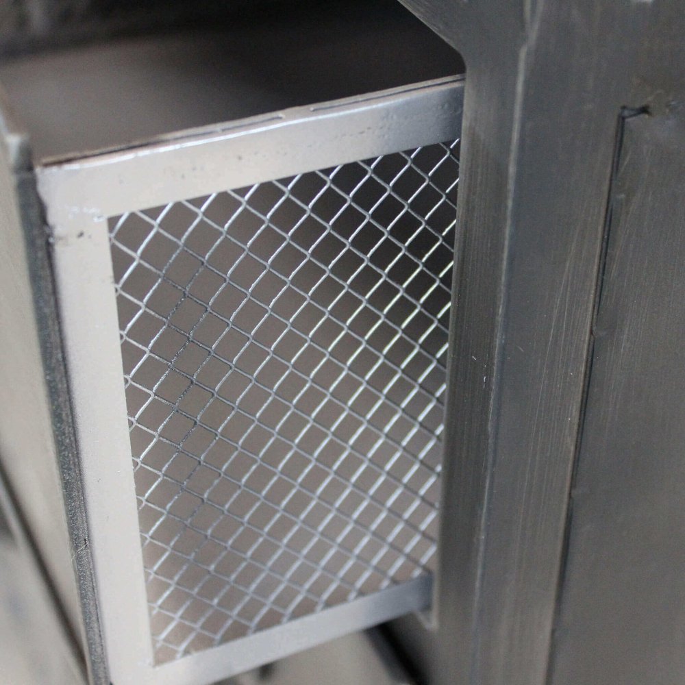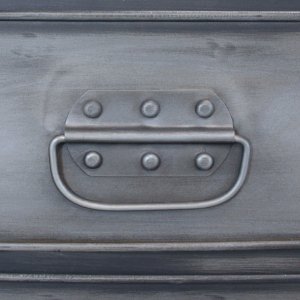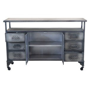 La *Madia per soggiorno Industrial in Acciaio cm 132,5×37,5×82 – HIRAM* è un elemento d’arredo dal carattere deciso, perfetto per chi desidera conferire uno stile urban e metropolitano ai propri ambienti. Interamente realizzata in acciaio nei toni grigio e antracite, questa credenza unisce funzionalità e design grazie alla presenza di 6 pratici cassetti, ripiani interni e 2 ante con finitura effetto vintage. Il lettering stampato in bianco con stile stencil militare – “Café des Délices, Vins & Spiritueux” – rafforza il mood industrial, evocando vecchie insegne dei bistrot francesi dal sapore autentico. Compatta nelle dimensioni ma estremamente capiente, la madia HIRAM è ideale per arredare soggiorni, open space, loft e ambienti in stile industrial o urban chic, offrendo uno spazio organizzato per piatti, bicchieri, liquori o oggetti decorativi. La robustezza dell’acciaio garantisce durata e resistenza nel tempo, mentre i dettagli visivi distintivi rendono questo mobile un vero punto focale nella stanza. La *madia HIRAM* esprime al meglio il suo carattere in contesti moderni e creativi, dove estetica e praticità trovano il perfetto equilibrio.