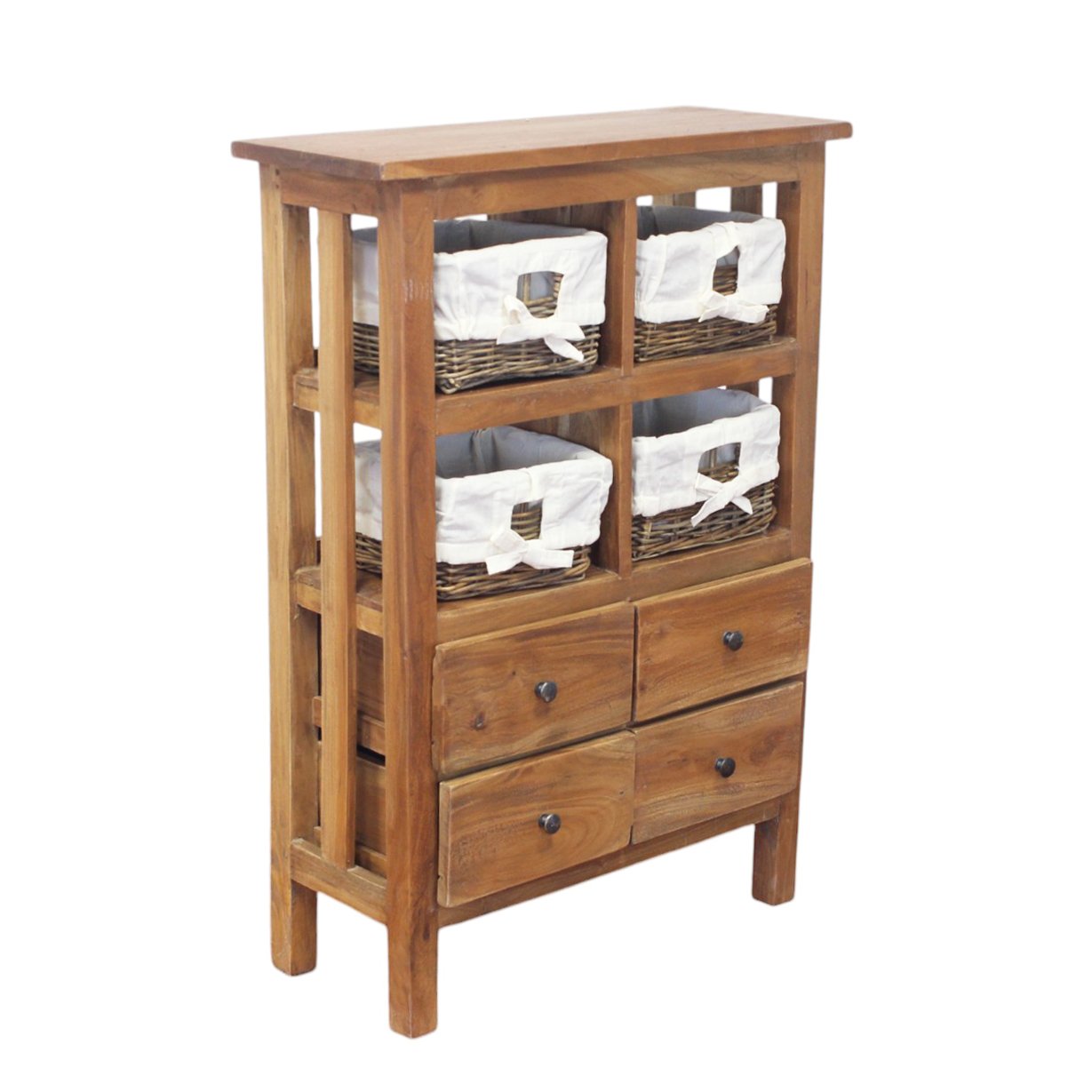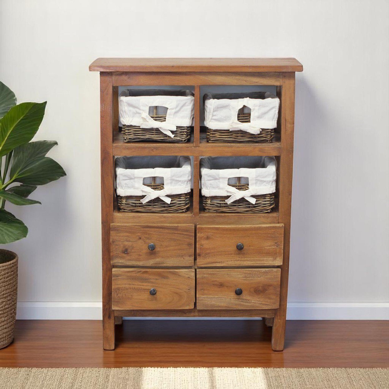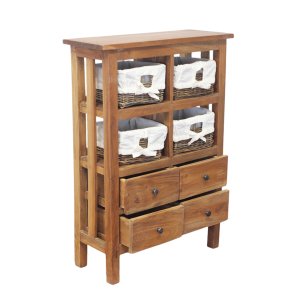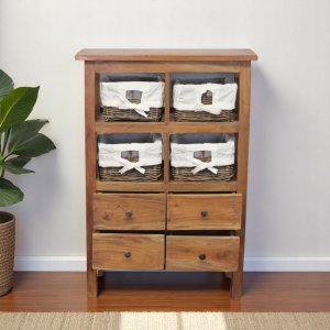Il mobile in legno 4 cassetti 4 ripiani con ceste – AGAPIA è una raffinata credenza in stile vintage, perfetta per chi desidera arredare con calore e personalità spazi domestici o ambienti ricettivi come hotel e B&B. Realizzato interamente in legno, questo mobile fisso unisce la praticità di quattro cassetti robusti alla versatilità di quattro ceste intrecciate, foderate in tessuto bianco, ideali per riporre piccoli oggetti in modo ordinato e decorativo. Il contrasto tra la naturale tonalità marrone del legno e il bianco delicato delle fodere crea un effetto visivo armonioso e accogliente, ideale per ambienti shabby chic, rustici o country. Le venature del legno e i pomelli in metallo nero conferiscono al mobile AGAPIA un carattere unico e artigianale, valorizzando la qualità dei materiali e la cura nei dettagli. Perfetta in un ingresso, un bagno o come complemento in una camera da letto o soggiorno, questa credenza porta con sé un’estetica senza tempo e una funzionalità intelligente, rendendo ogni ambiente più caldo e organizzato.