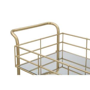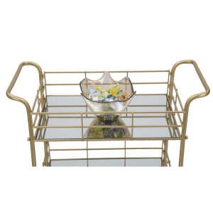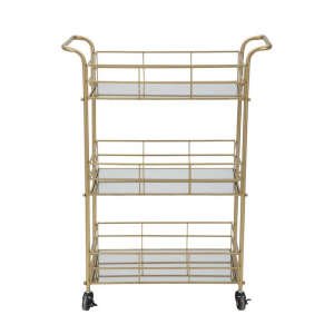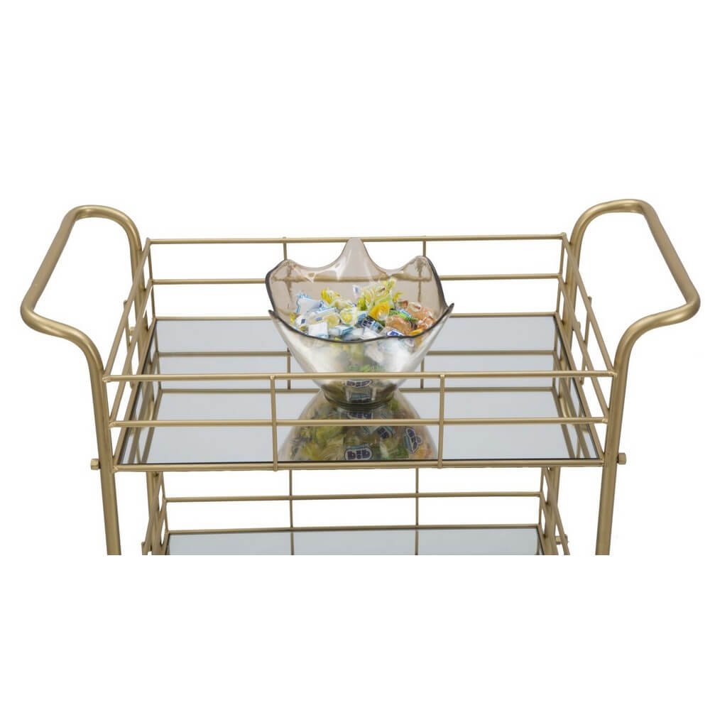 Carrello rettangolare in metallo dorato con tre ripiani in specchio. Un tocco d’oro non può mancare in una casa glam. Il carrello con ripiani specchiati è un elemento che diventa un punto luce in ogni ambiente