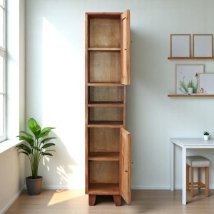 Il Mobile colonna in legno rustico 2 ante 2 ripiani – AUGUSTA è la soluzione ideale per chi desidera coniugare funzionalità e autenticità in un arredo dal forte carattere artigianale. Realizzato interamente in pregiato legno di mogano, si distingue per la finitura naturale color marrone caldo che valorizza le venature e le imperfezioni del materiale, enfatizzandone l’anima rustica. Con dimensioni contenute (35 cm di larghezza, 30 cm di profondità e 170 cm di altezza), questa colonna salvaspazio fissa è perfetta per arredare ambienti come il bagno o aree di servizio in contesti residenziali o in ristoranti dall’estetica tradizionale. Lo stile arte povera si riflette nelle linee essenziali e nel design funzionale, completato da due ante con manopole in ferro scuro e due ripiani a giorno centrali che consentono un’organizzazione pratica e immediata. Il Mobile colonna AUGUSTA trasmette una sensazione di calore e autenticità, ideale per completare ambienti dallo stile rustico o country con un tocco di eleganza sobria e senza tempo. Si integra al meglio in spazi dove il comfort visivo e la qualità dei materiali fanno la differenza.