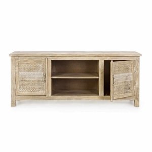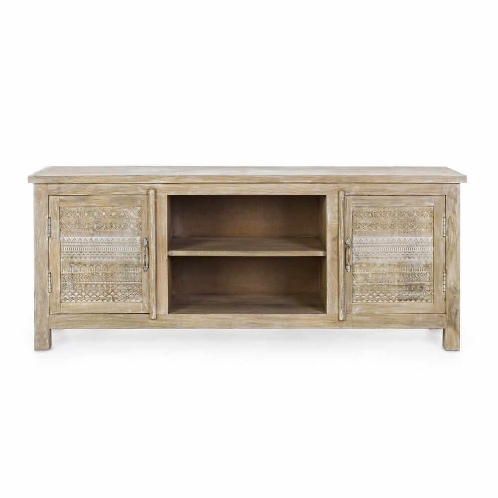 Il Mobile Basso Legno Marrone Rustico da Interno – LENA è un raffinato esempio di arredo casa che coniuga funzionalità e stile in un’unica soluzione d’effetto. Realizzato in legno di mango di alta qualità, questo mobile porta TV si distingue per le sue eleganti decorazioni intarsiate a mano sulle ante laterali, che donano un tocco autentico e artigianale. La finitura calda in marrone chiaro, ottenuta con base di nitrocellulosa, esalta le venature naturali del legno, regalando all’ambiente un’atmosfera accogliente e vissuta, perfetta per uno stile rustico o boho chic. Le pratiche maniglie in ottone aggiungono un dettaglio sofisticato e funzionale, mentre la struttura con vani a giorno e comparti chiusi offre tutto lo spazio necessario per dispositivi elettronici, libri o oggetti decorativi. Il retro in MDF completa la struttura con stabilità e resistenza, ideale per sostenere anche TV di grandi dimensioni. Il mobile basso LENA è perfetto per arricchire la zona living con personalità e calore, trasformando ogni momento di relax in un’esperienza di benessere estetico totale.
