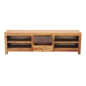Il Mobile porta TV in legno rustico – DAMOCLES è una sofisticata proposta d’arredo che unisce la solidità del legno di mogano alla forza espressiva dello stile industrial. Con dimensioni di 170 cm di larghezza, 35 cm di profondità e 50 cm di altezza, questo mobile fisso rappresenta una scelta ideale per ambienti contract come hotel, ma si adatta perfettamente anche a salotti privati dal design ricercato. La finitura marrone calda mette in risalto le venature naturali del legno massello, conferendo al mobile un aspetto autentico e vissuto. I sei vani aperti offrono praticità per organizzare dispositivi multimediali, libri o accessori, mentre i due cassetti con frontali leggermente differenziati – uno grezzo, uno levigato – aggiungono un tocco materico distintivo che esalta lo stile rustico-industriale dell’arredo. Il Mobile porta TV DAMOCLES non è solo funzionale ma è anche una vera e propria dichiarazione estetica: un elemento d’arredo perfetto per chi desidera creare un’atmosfera calda, accogliente e dal carattere deciso. Ideale per accogliere TV e accessori tecnologici con eleganza in un contesto che predilige materiali naturali e lavorazioni artigianali.