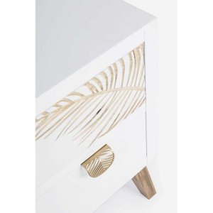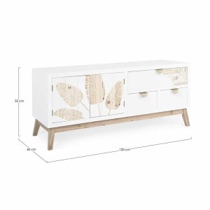 Il Mobile Porta TV Legno Bianco Boho da Interno – LEAF è l’elemento d’arredo perfetto per chi desidera coniugare funzionalità e stile naturale all’interno della propria casa. Realizzato in legno di abete e MDF con finitura bianca a base d’acqua, questo mobile si distingue per il suo design boho raffinato, impreziosito da decori intarsiati a mano a forma di foglia, che decorano elegantemente i frontali di ante e cassetti. Le linee pulite e il contrasto tra il bianco luminoso della struttura e il tono caldo naturale del legno delle gambe, conferiscono a questo mobile TV una forte personalità, delicata ma di grande impatto visivo. Le maniglie in acciaio, anch’esse decorate con motivo foglia, completano l’insieme con un tocco distintivo e armonioso. Ideale per ambienti interni in stile boho, scandi o naturale, il mobile porta TV LEAF offre un’ottima soluzione per organizzare lo spazio con eleganza, grazie alla capienza delle sue ante e dei tre cassetti. Perfetto in salotto o nella zona living, aggiunge un’atmosfera rilassata e accogliente, valorizzando l’ambiente con una bellezza senza tempo.