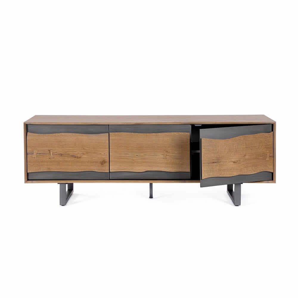 Il Mobile Porta TV Legno Marrone Industriale da Interno – BRAMBLE è la scelta ideale per chi desidera unire stile contemporaneo e funzionalità in un unico elemento d’arredo. Con un design industriale ricercato, questo mobile porta TV si distingue per la struttura in MDF impiallacciato rovere con finitura naturale verniciata ad acqua, che mette in risalto le venature autentiche del legno e dona calore all’ambiente. Le ante, caratterizzate da un elegante profilo ondulato e da una doppia tonalità marrone-antracite, si aprono su un vano interno dotato di mensola, offrendo uno spazio contenitivo pratico ed elegante. I dettagli tecnici di pregio, come la chiusura ammortizzata in acciaio e le gambe in acciaio verniciate a polvere epossidica da assemblare, garantiscono stabilità, durabilità e un look moderno perfettamente bilanciato. Il mobile BRAMBLE si inserisce con naturalezza in soggiorni, open space e salotti moderni, valorizzando televisori di ogni dimensione e contribuendo a definire un’atmosfera sofisticata e accogliente.
